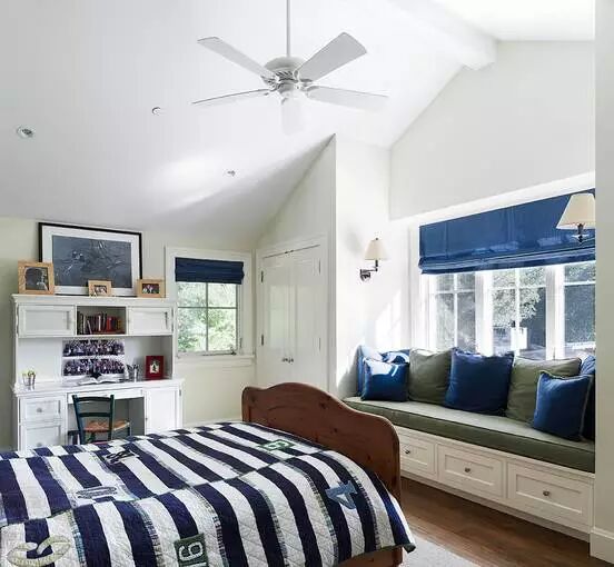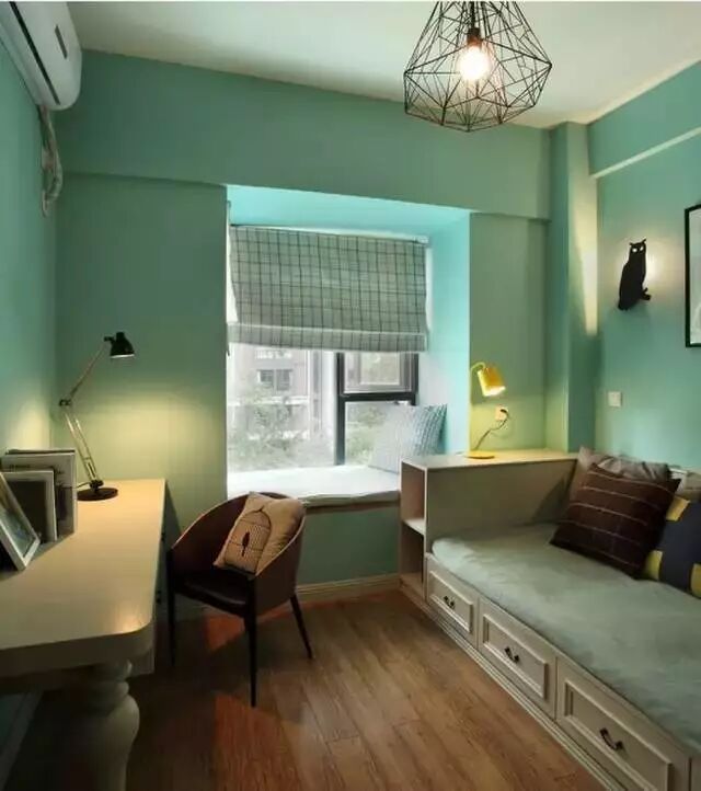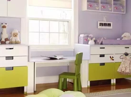 ▲使用飘窗台面规划成书桌,搭配一个小小的绿色靠背椅,儿童房瞬间活力起来。