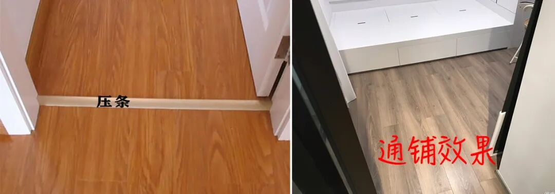 其实地板通铺较大的区别就是压条有无使用。通铺的效果完胜压条,地面一马平川,再也没有突兀的压条出现在视线里了。