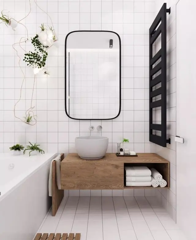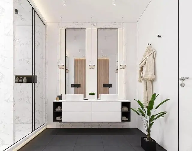 11、除了台上盆,带脚的浴室柜也容易形成卫生死角,建议选择壁挂式浴室柜,离地大约30-50cm以上,可以塞得下拖把即可。