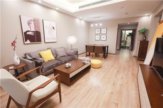 客厅:客厅设计与元素简单温润,大地色系软装与地板映射着时间的沉淀,似将故事娓娓道来,不疾不徐、温文尔雅。