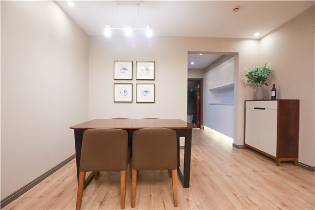 餐厅:在客厅与厨房的转角,简单的深色餐桌椅矗立在墙边,一字型吊灯驱走黑暗,低调、沉稳的空间得以展现。