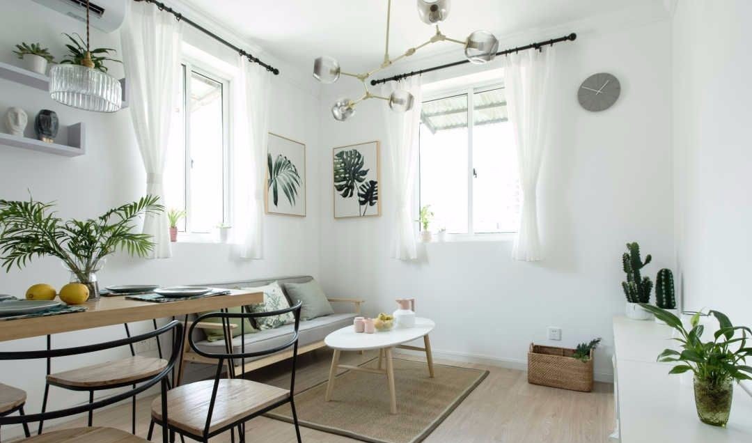 客餐厅加一起只有3.3米长,2.8米宽,这么小的空间,建议使用不超过1.5米。宽度不超过80公分的双人沙发,在选型上,选用细脚,餐桌椅,也选用铁艺的细脚,尽可能的感官上使得空间不那么局促,颜色选用浅木色系,如果要选用地毯,建议不要超过沙发的宽度
