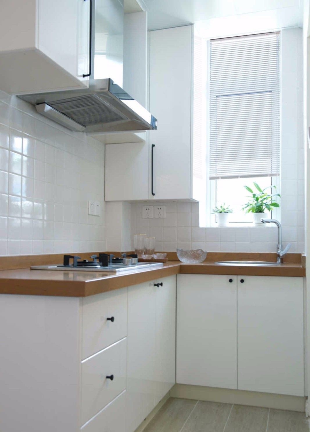 厨房的面积比较小,做了简易的L型厨房,对于不经常煮菜的小夫妻已经足矣,可以将更多的面积留给玄关,储物空间。