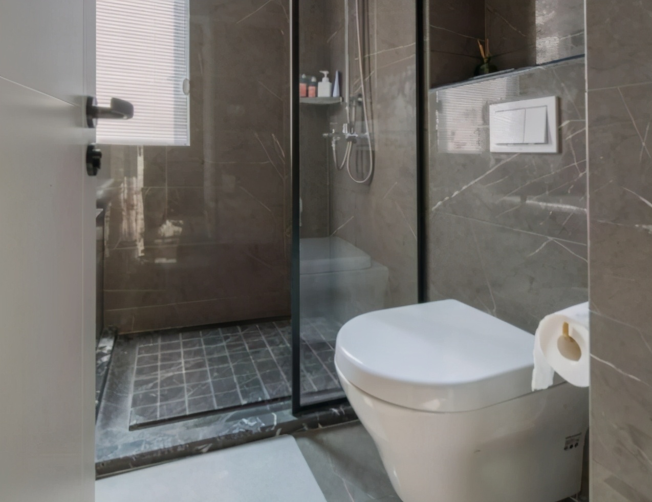 在淋浴区地面铺一块石材,石材上面拉槽(也有人做火烧酸洗面),一方面是防滑,一方面是导流