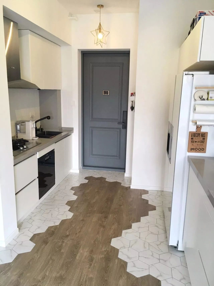 过道式厨房,就是指从大门在进入玄关后,厨房就布置在玄关的左或右侧,以长条格局的操作台,在保持宽松的生活动线的同时,又能在小面积的空间内挤出一个实用的厨房,是小户型中非常巧妙的设计。