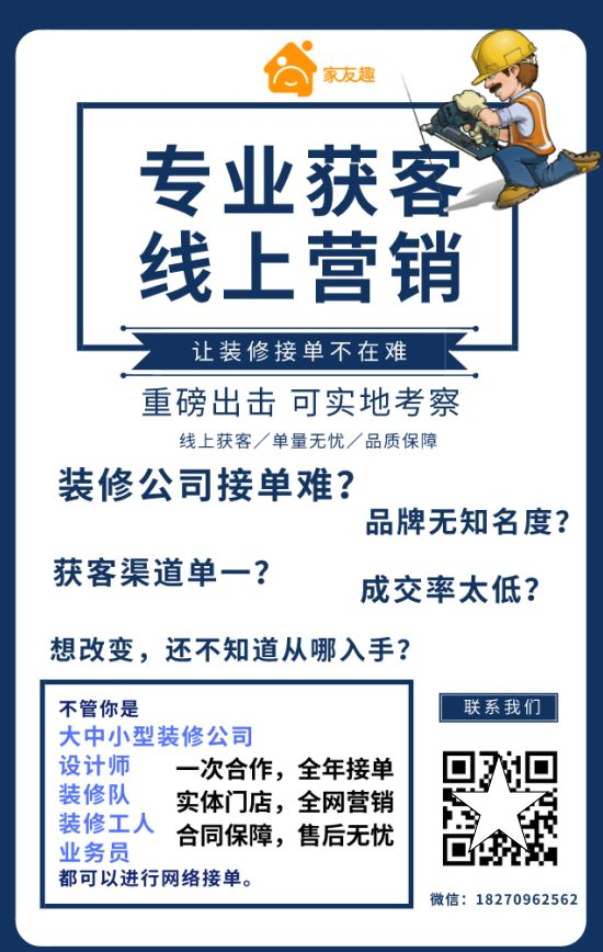 编辑总结:以上就是关于装修公司客源的话题介绍,希望可以帮助大家了解更多装修知识、装修公司评价、装修案例请继续关注家友趣装修网!
