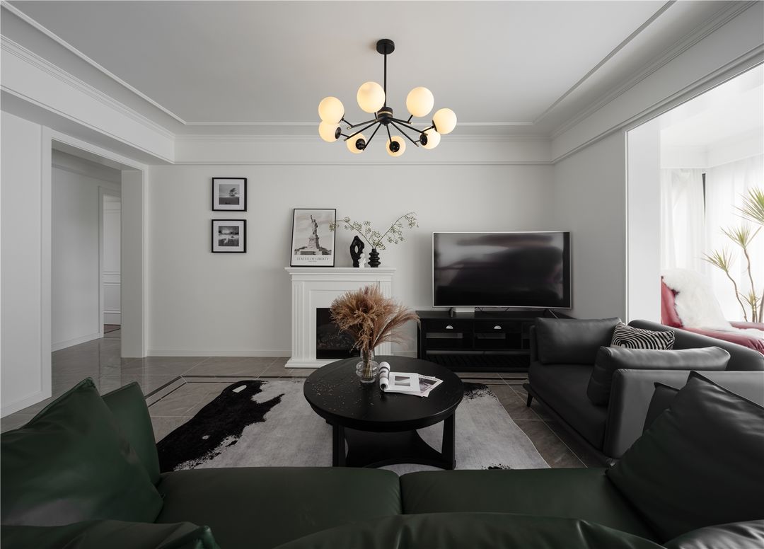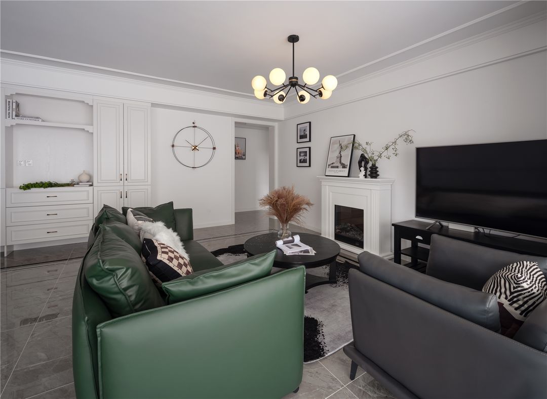 屋主平时不看电视,开始是说不要电视位的,但是男屋主喜欢看球赛,所以在墙边还是保留了电视位置,看球赛必须是大屏幕才有感觉。不过平时基本不开,电视墙这边设计了壁炉,里面是暖气,实用美观。