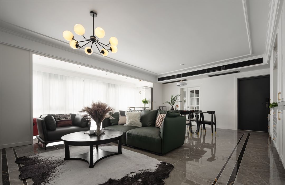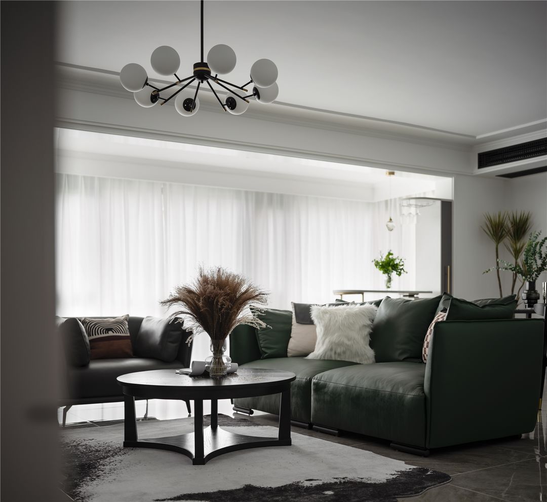 客厅灰白的主色调十分具有包容性,是朴素安静又有质感的颜色,它不会过于暗沉,亮度又不是非常的高,客厅配了个翠绿的沙发,为空间注入了一抹生机,又不会显得突兀。似乎在灰白色的空间里任何色彩都不会显得突兀。