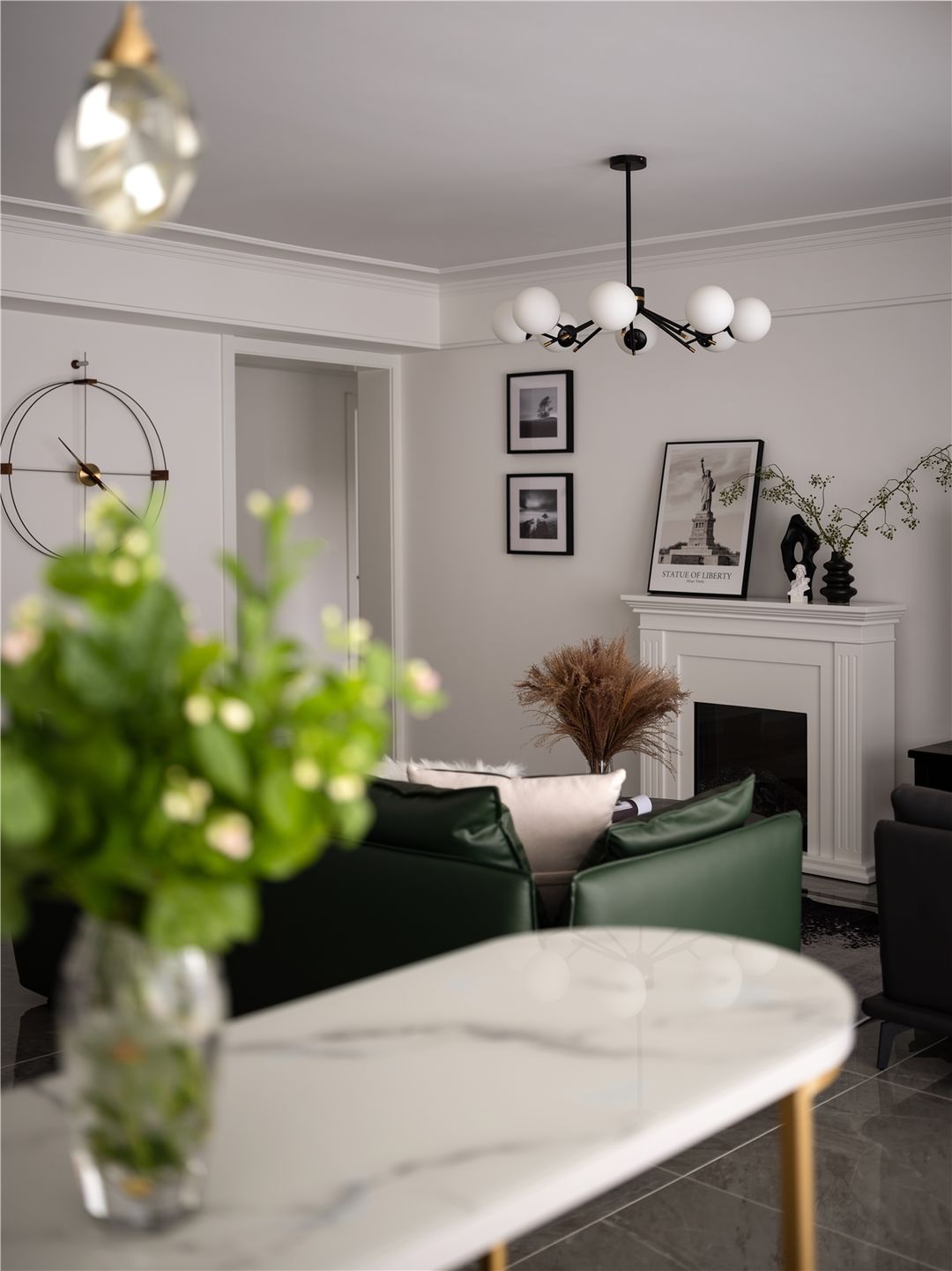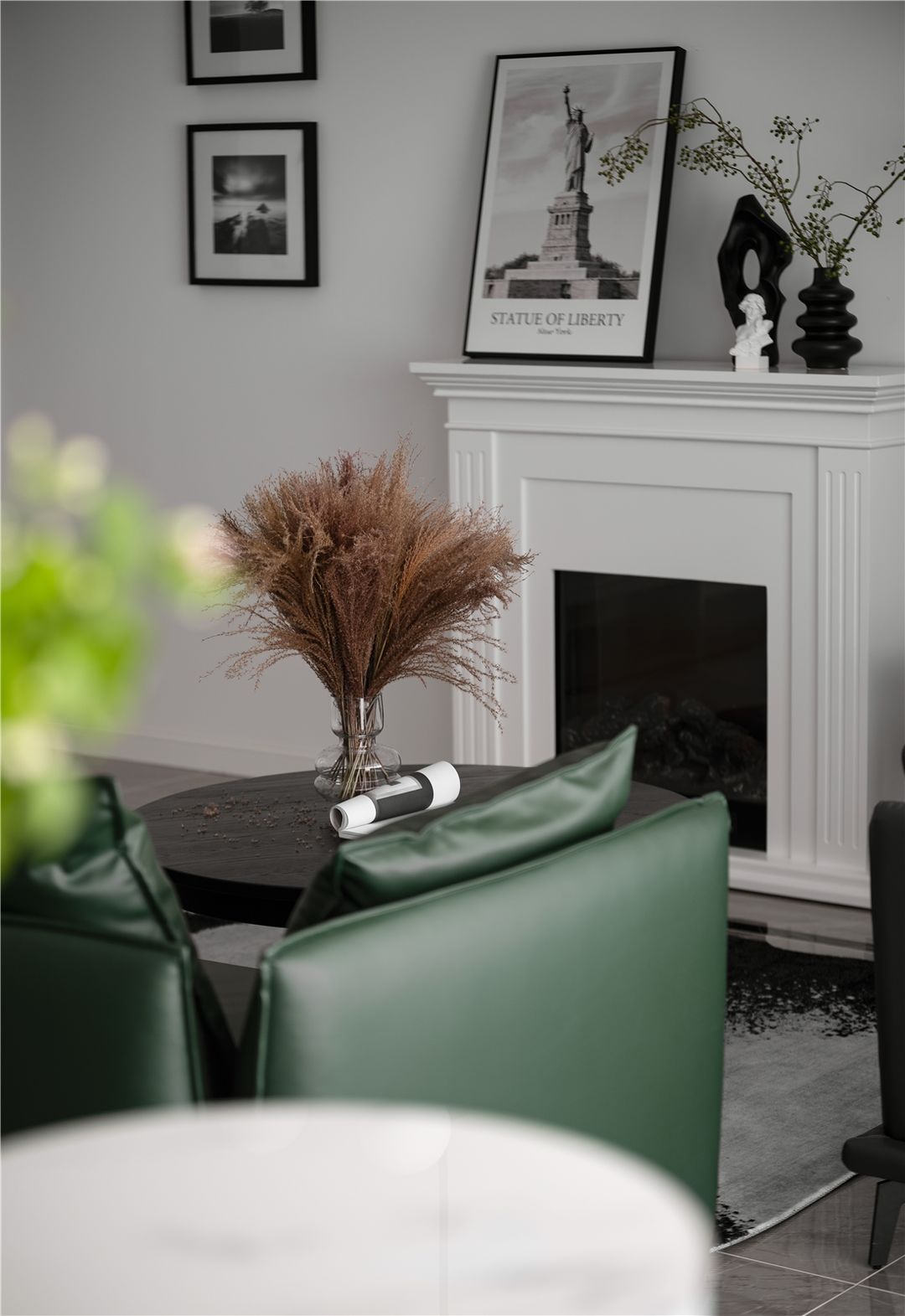 壁炉前茶几上那一捧凋零的芦苇花、温馨的挂画、和煦的灯光,让客厅的一角成为最具有情调的生活空间。角度由近拉远,凋零的芦苇花与新生的绿植相互映衬,总会让人从内心深处感受到自然、质朴的美好。