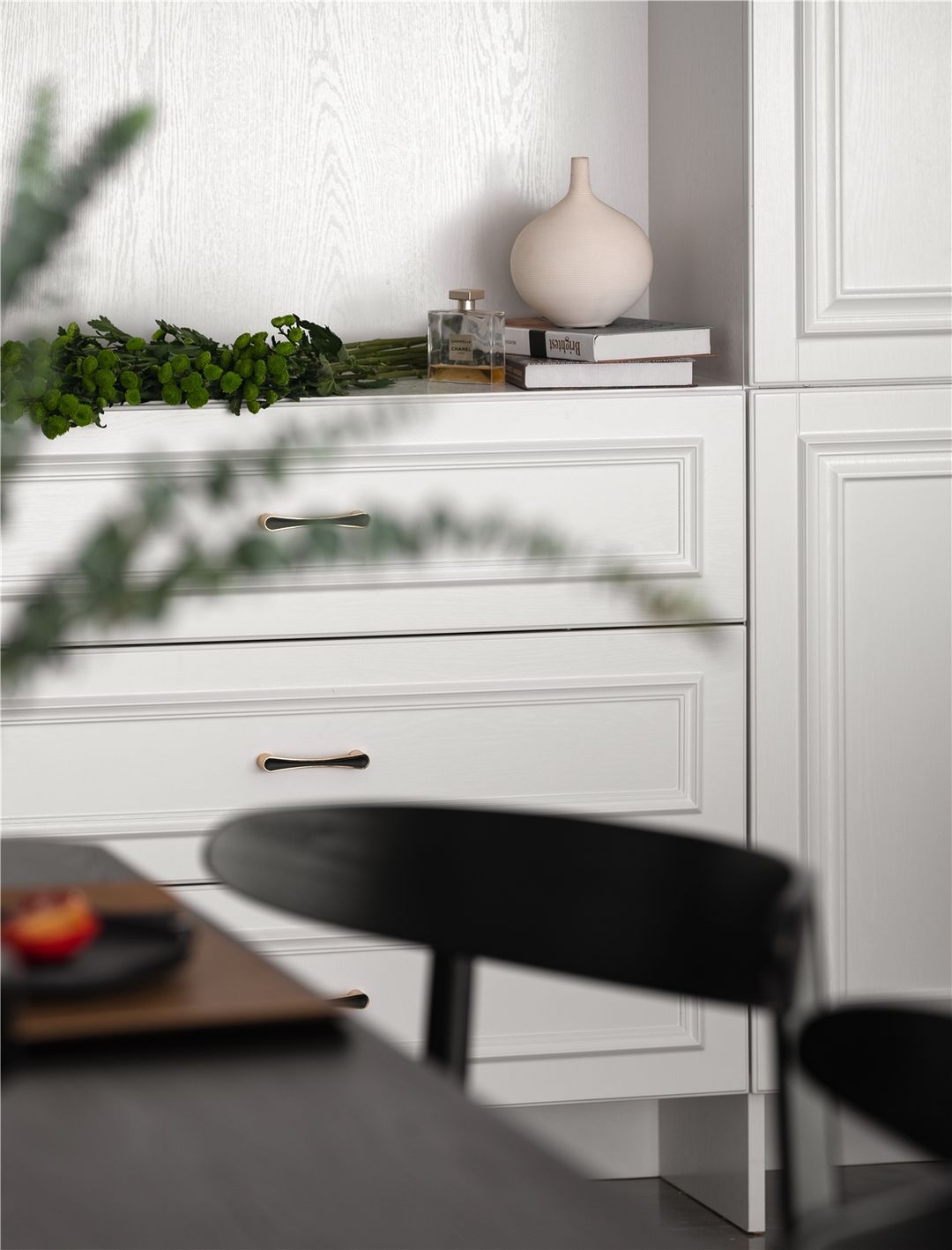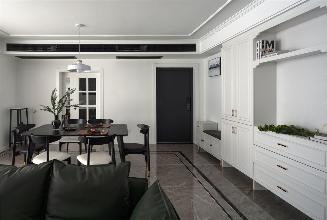 餐厅边进门处,屋主说不能太空旷,所以定制白色柜子,既补充门口鞋柜空间,又为餐厅和客厅提供了收纳储物空间。白色的柜体与整体墙面颜色一致,不冲突,丰富了空间内容和功能性。