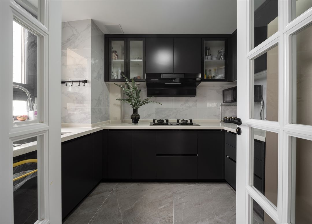 作为中国家庭,烹饪少不了油烟,封闭式中厨能阻挡油烟弥漫。依然是黑白色搭配打造干净的烹饪区域,黑白色的厨房与餐厅色调一致不仅经典耐看,而且稳重大气又充满神秘感。