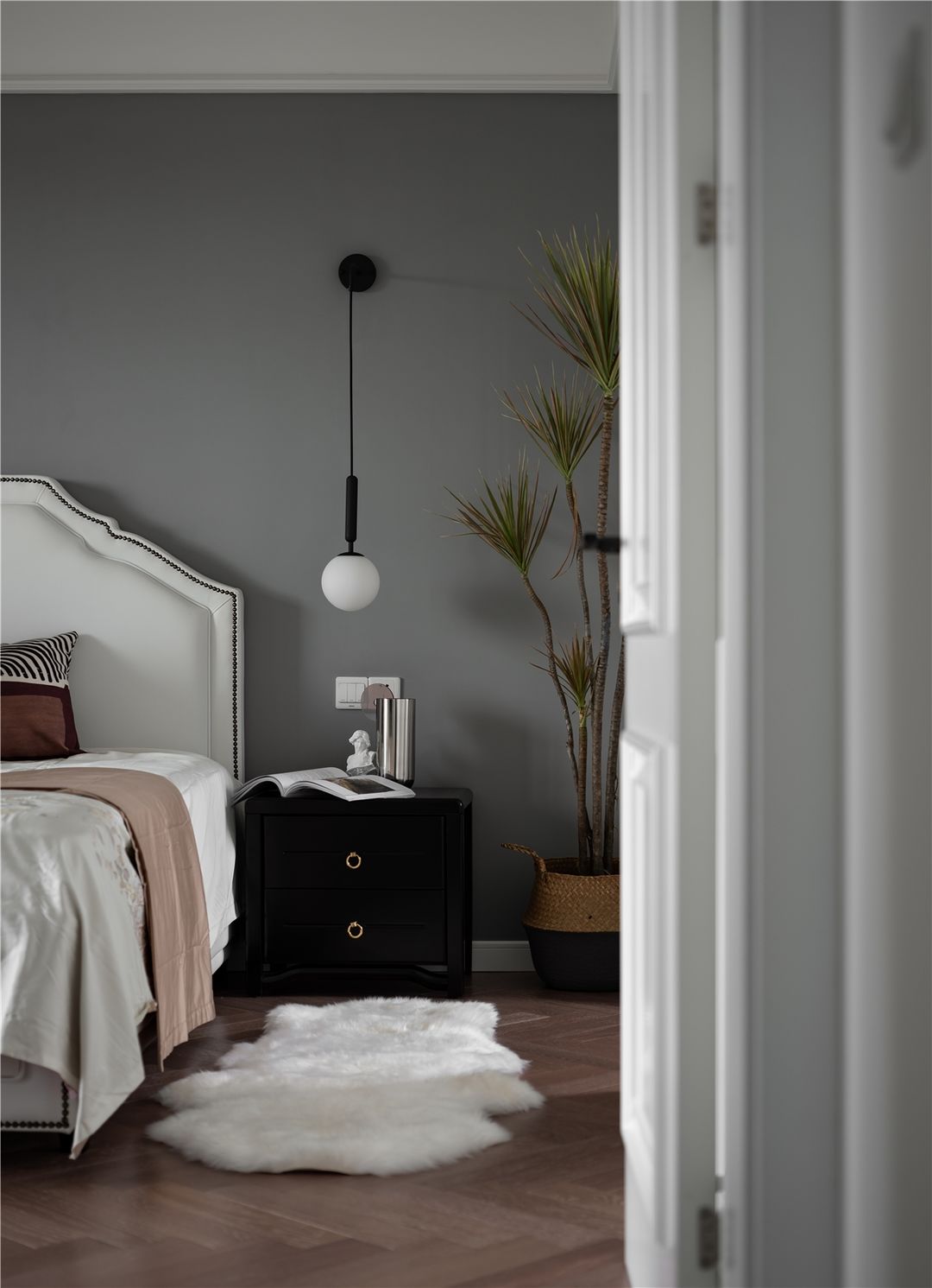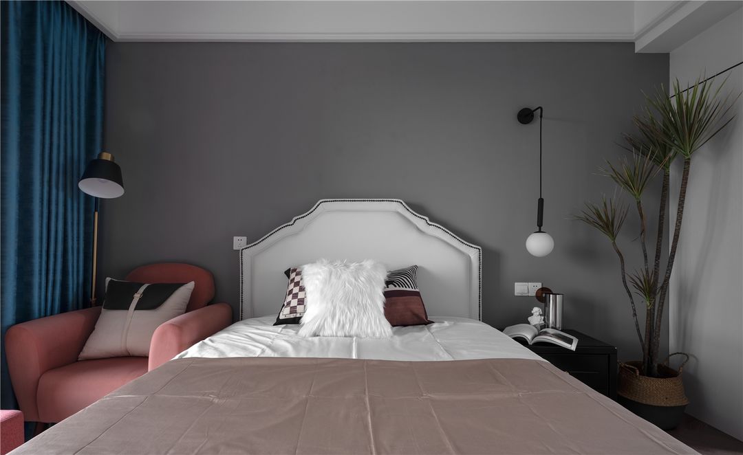 灰色为背景色的卧室,显得更加的静谧,搭配白色的床品、软装进行点缀,避免灰色的空间过于单调。白色的床、黑色的床头柜以及灰色的墙面,黑白灰三色的搭配,简约优雅,素净又大气,是永远不会落伍也看不厌的色彩组合,非常适合不注重绚丽、追求纯粹自然、简单质朴的房主。