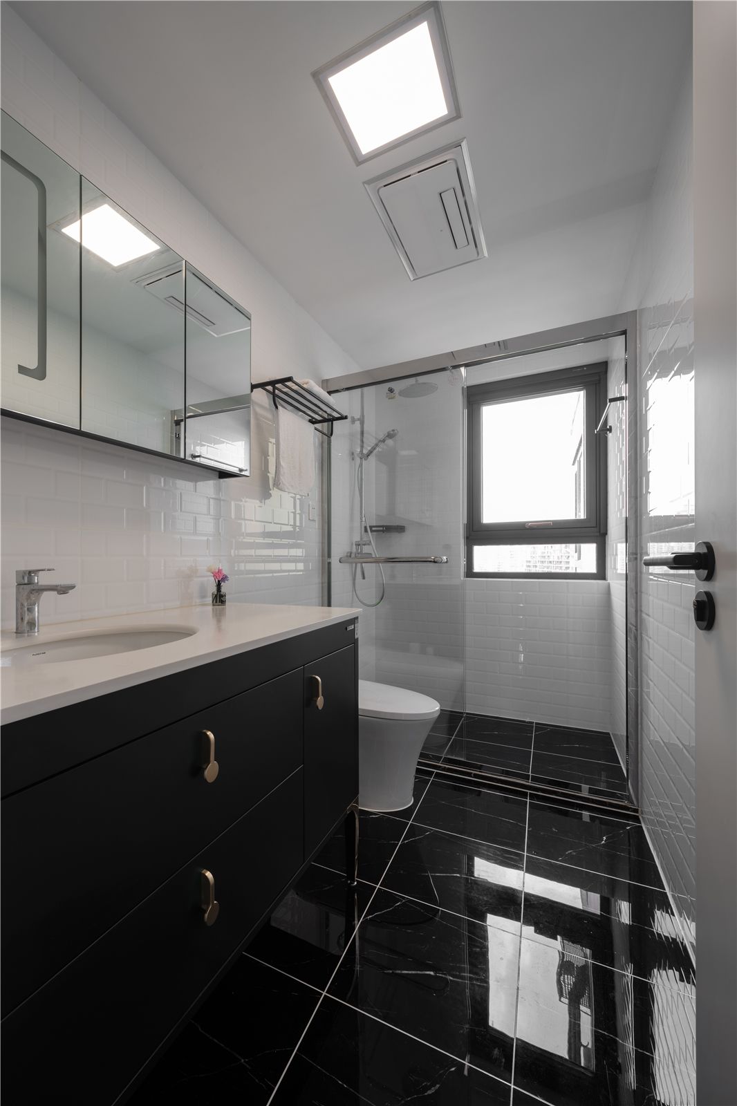 白色长条瓷砖形成的砖墙纹理,加强卫生间的层次,同时地面上有白色纹理的黑色瓷砖,简洁又大方。方便打理的黑白色,加上了绿色的台盆柜,让空间色彩不再单调,又富有生机。