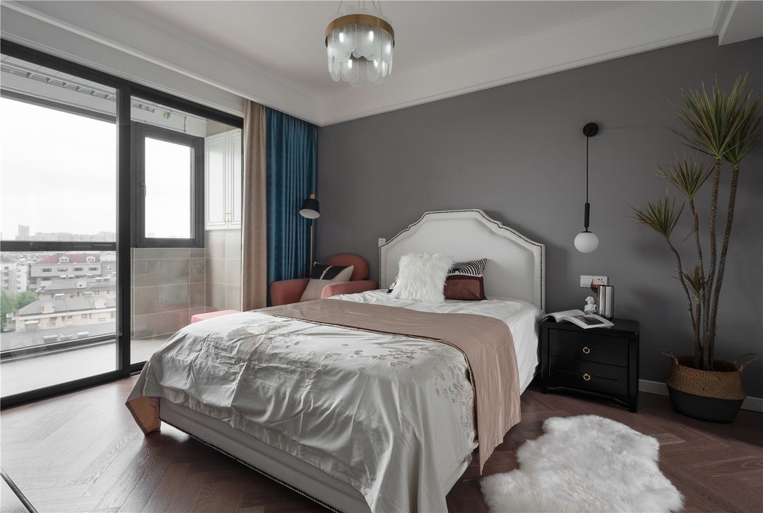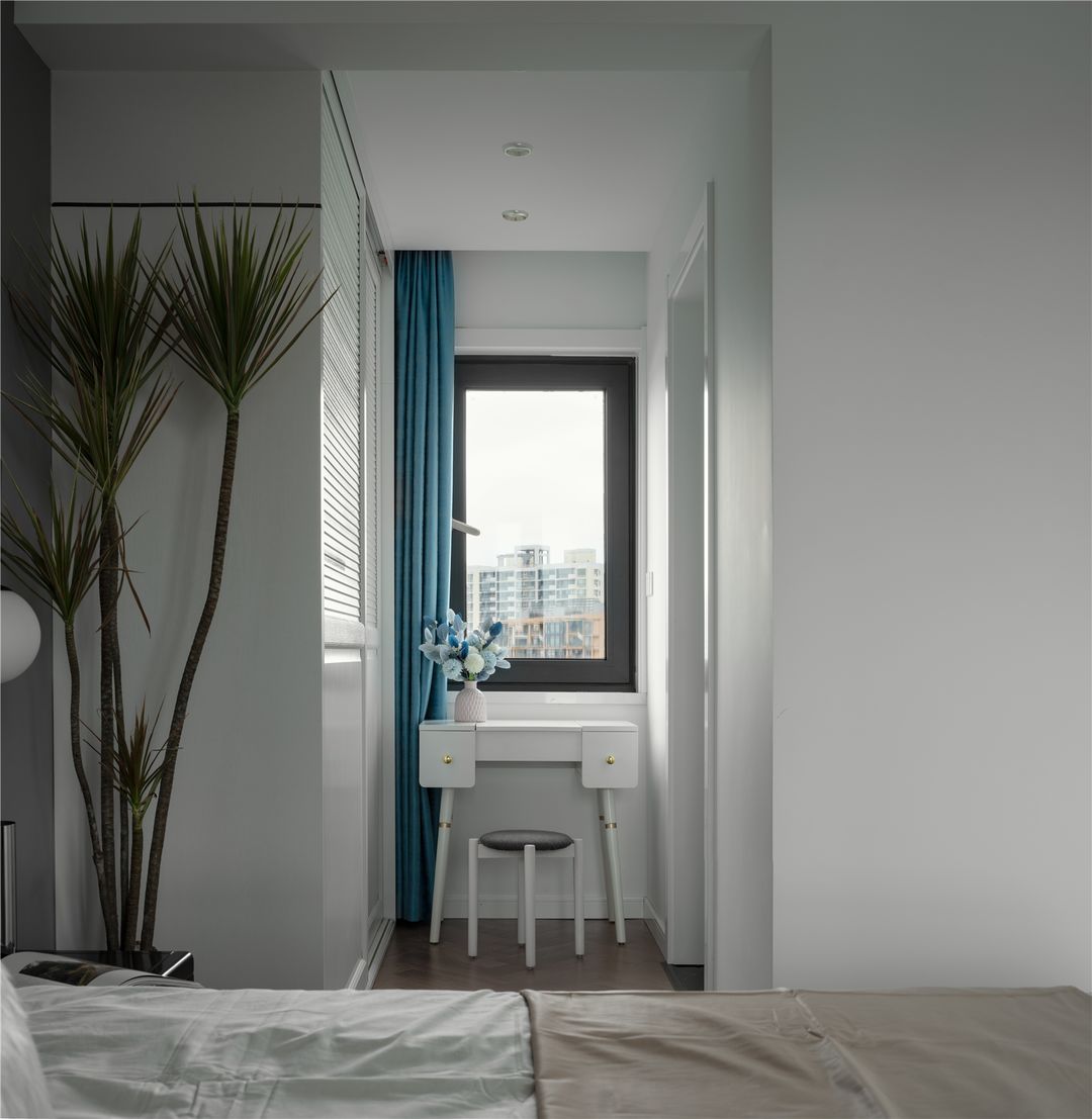 主卧南面是阳台,北面有扇小窗户,真正的南北通透,小窗边正好放下一个小化妆桌,虽然没有化妆品,但是可以放放首饰,也可以在这里看看书看看风景,是女主每天精致生活的开始。