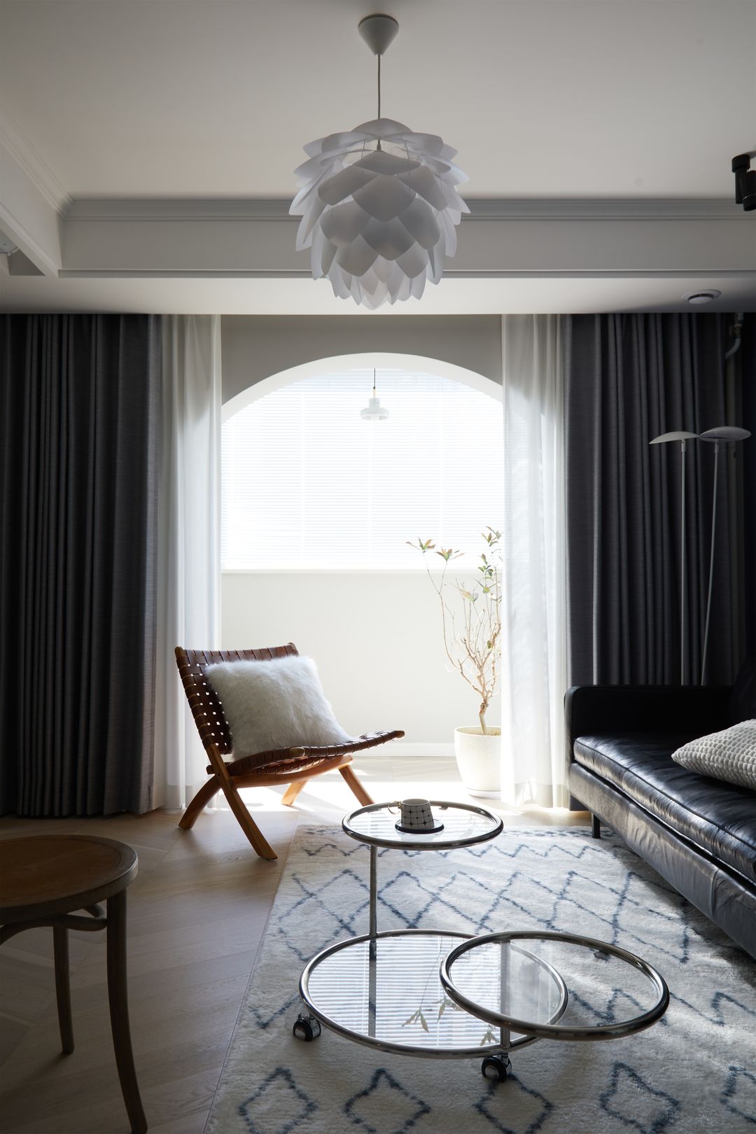 将阳台以一道弧形门洞柔和纳入室内,开阔了空间的视野,引进了更加充裕的光线。