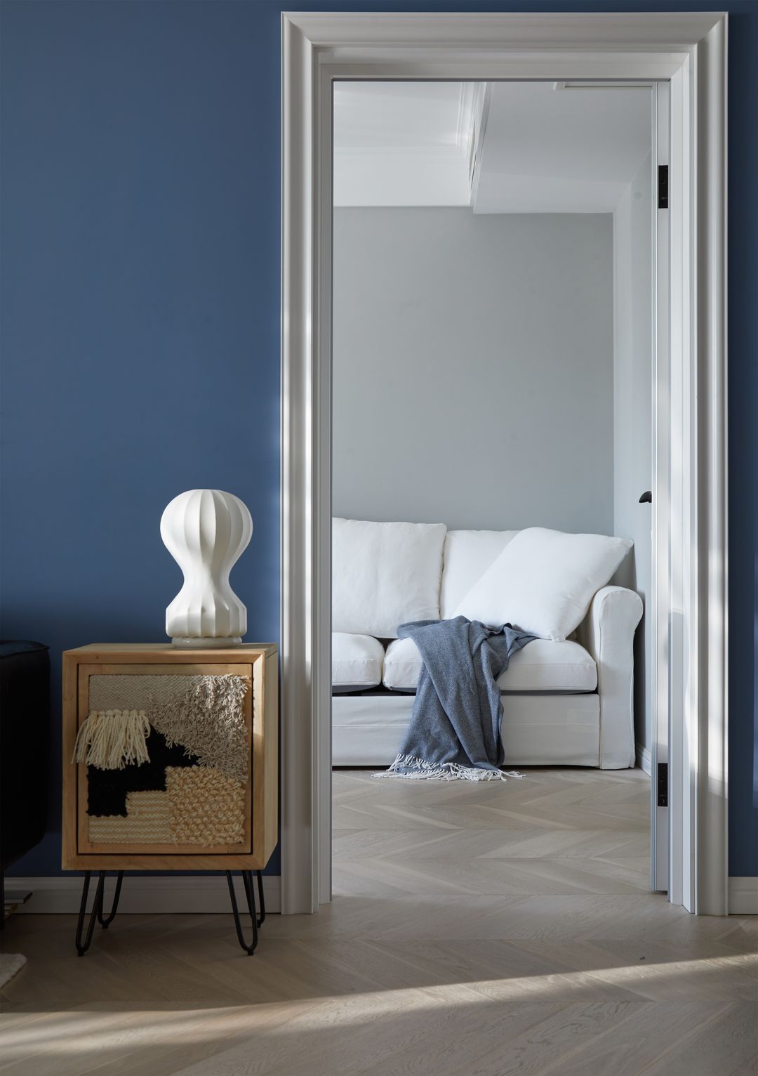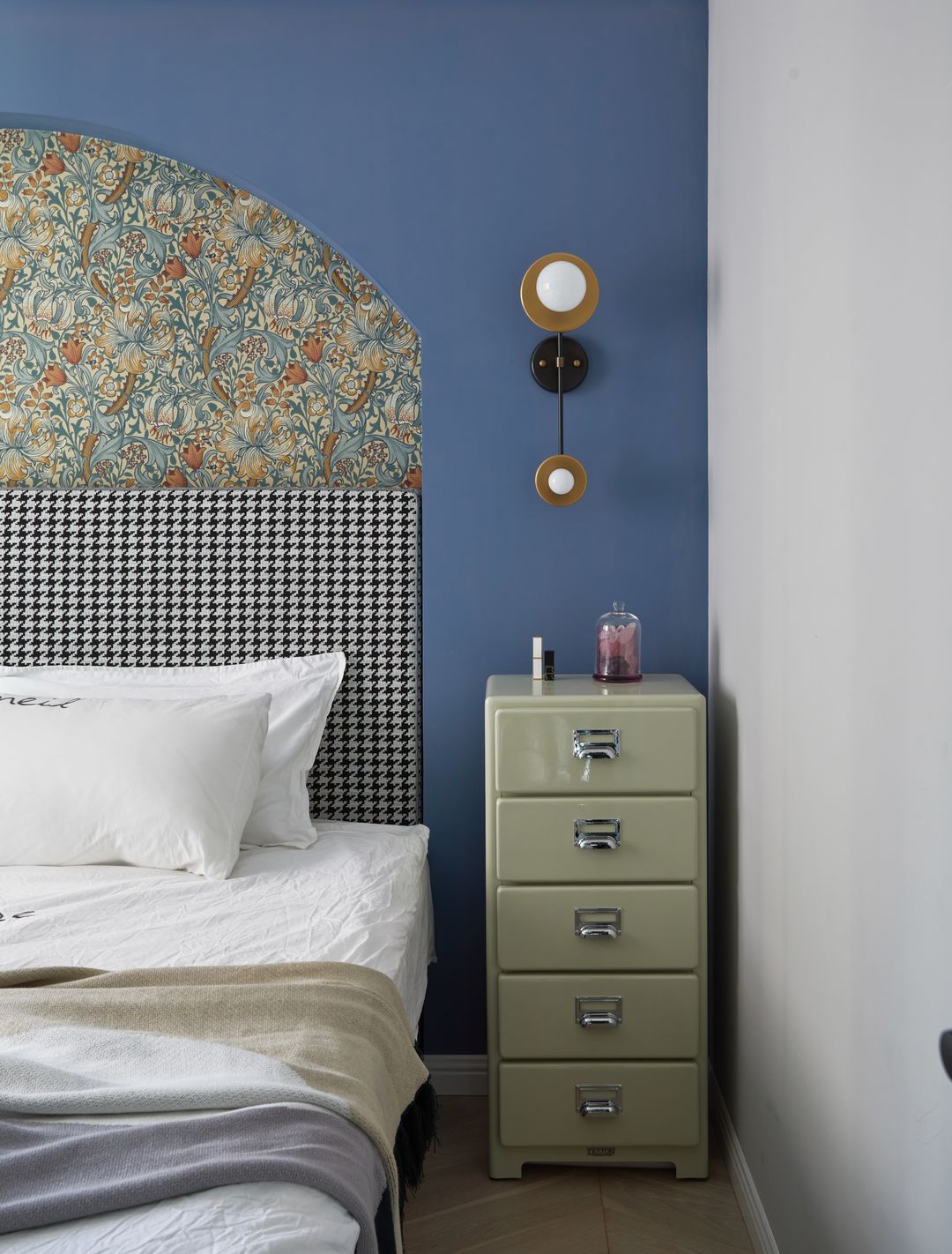 客户非常喜欢灰蓝色系,在充分评估卧室采光以及夫妻两人对色彩的接受度后我们将主卧做成了整体灰+蓝色,极强的包覆感让人更易入眠。