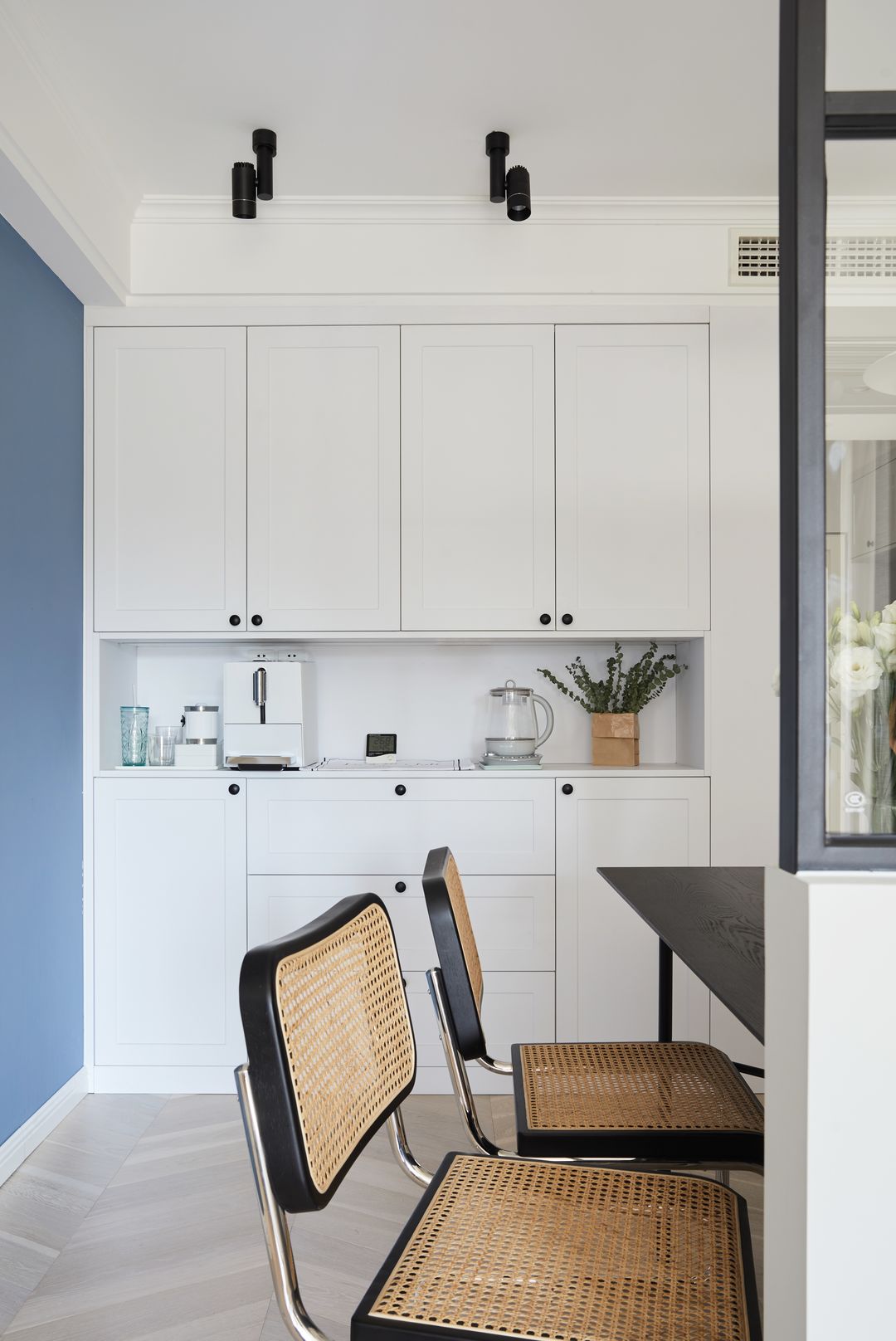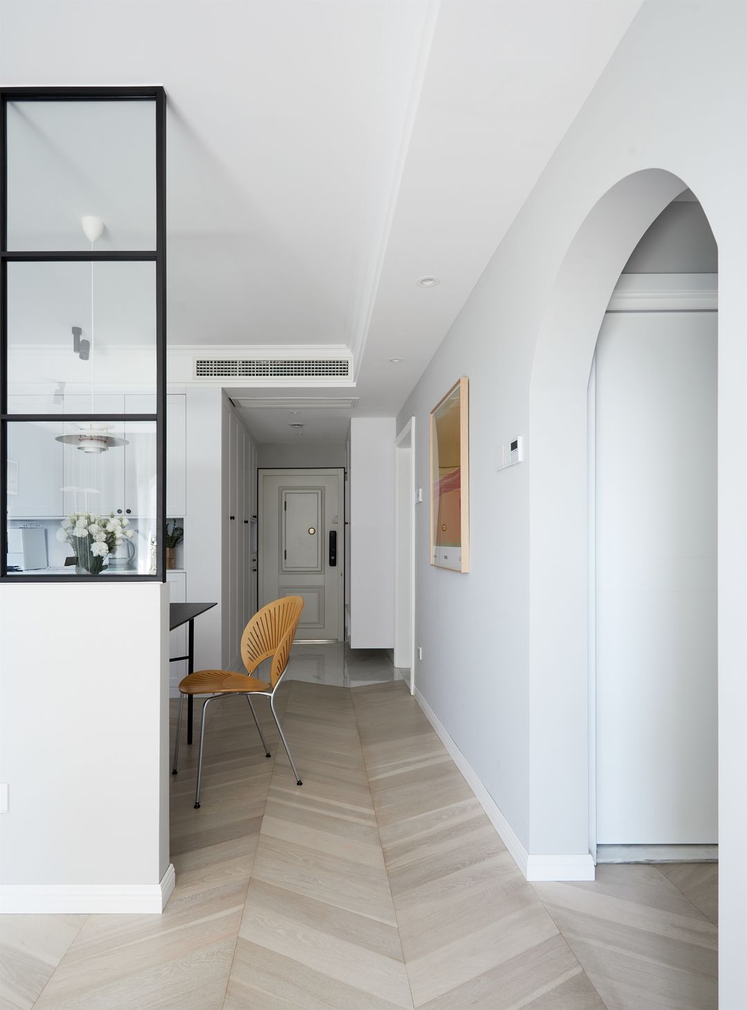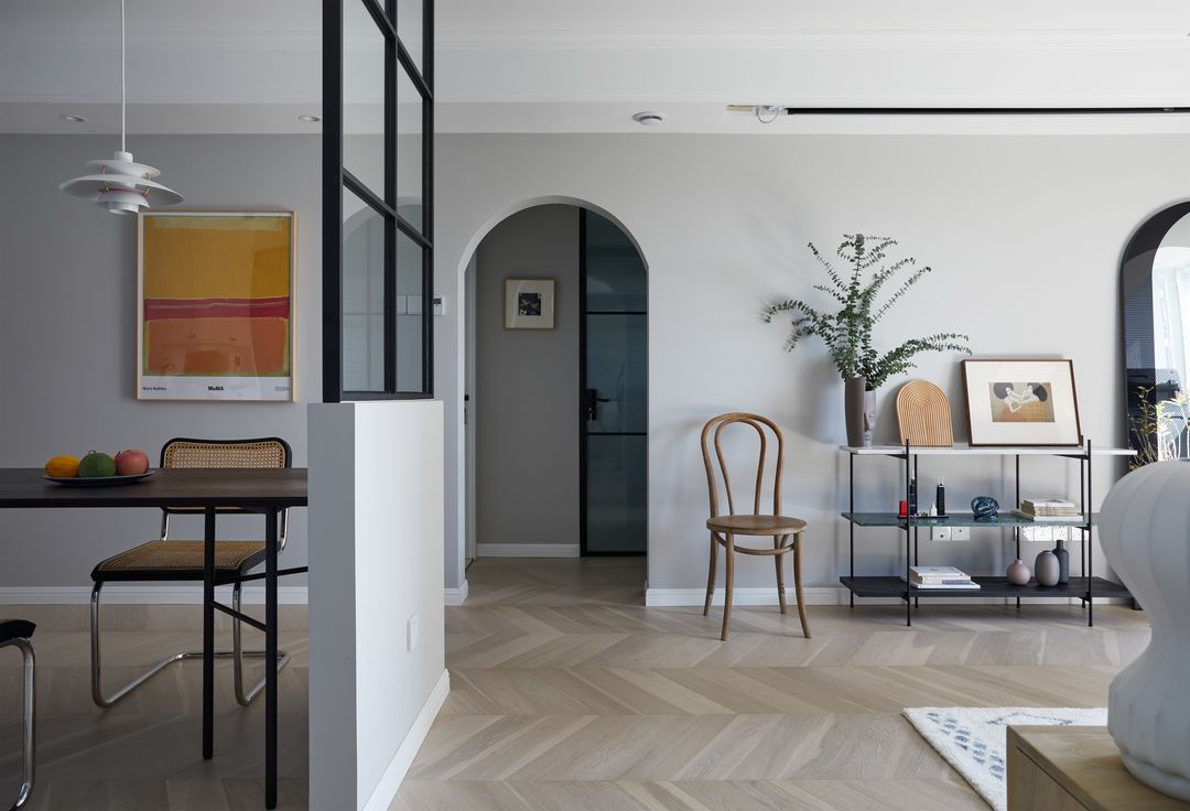 餐厅洄游动线的一侧,连接着门厅玄关、厨房,地面做了瓷砖与鱼骨拼地板的方式。