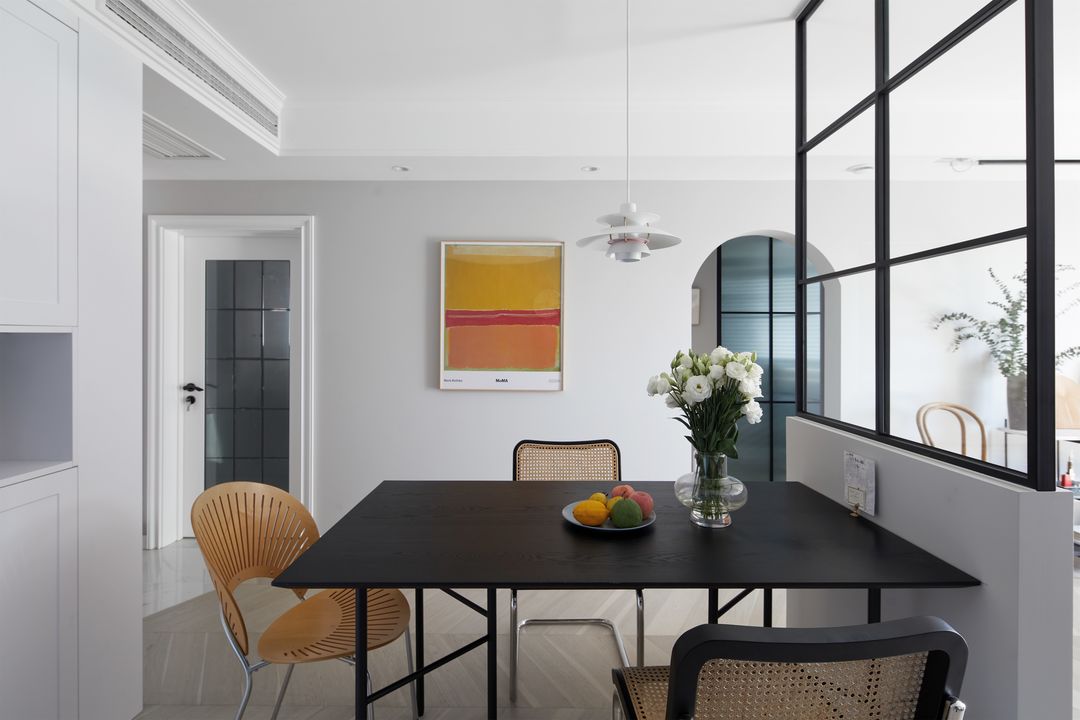 以隔断为中线,客厅的另一边就是餐厨区域,在灰色的整体基调下,加入了女主人喜欢的色调,温柔与冷冽相映成趣。