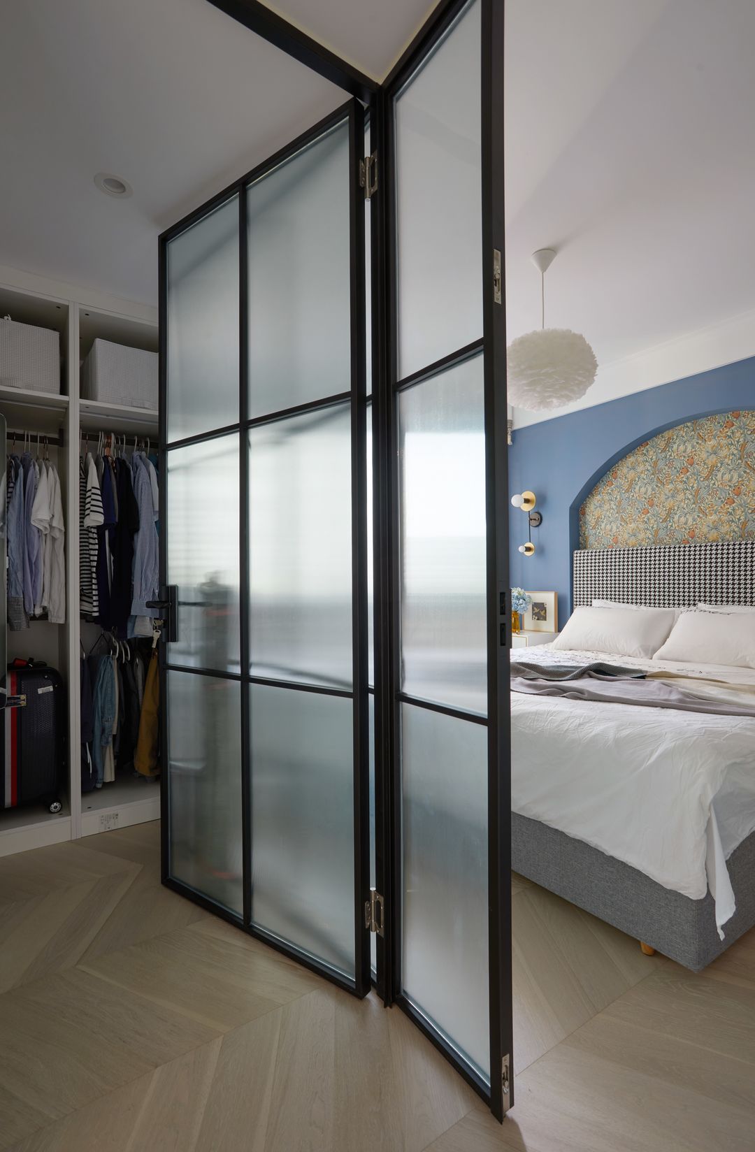 玻璃隔断围合形步入式衣帽间,通透不压抑;