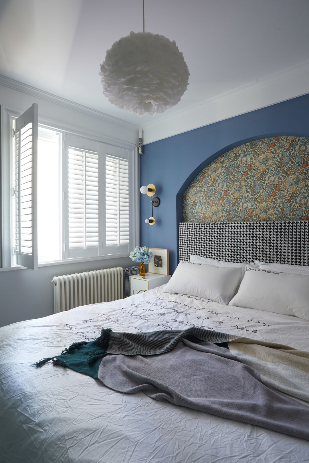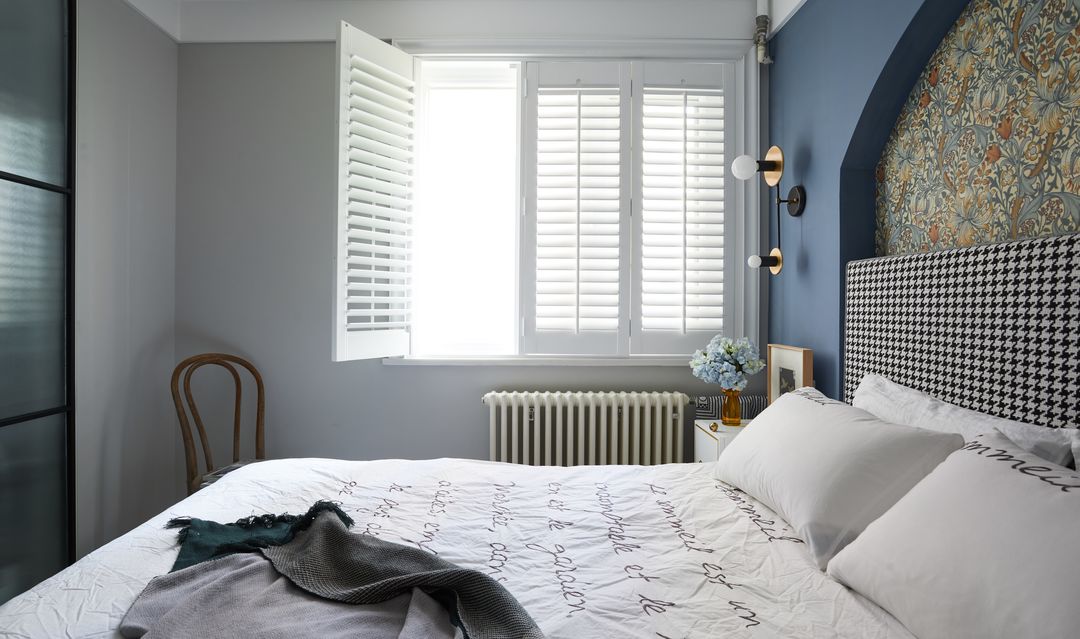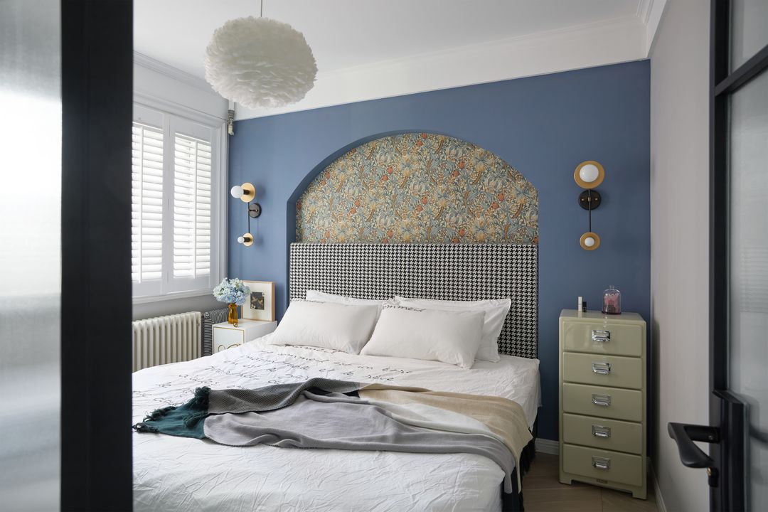床头凸起的造型背景墙,功能上包裹了原始的暖气管道,色系和造型都与客厅呼应做了户型、刷了蓝色漆,木质百叶窗的引入是希望卧室更有呼吸感的独家的心理舒适期望。