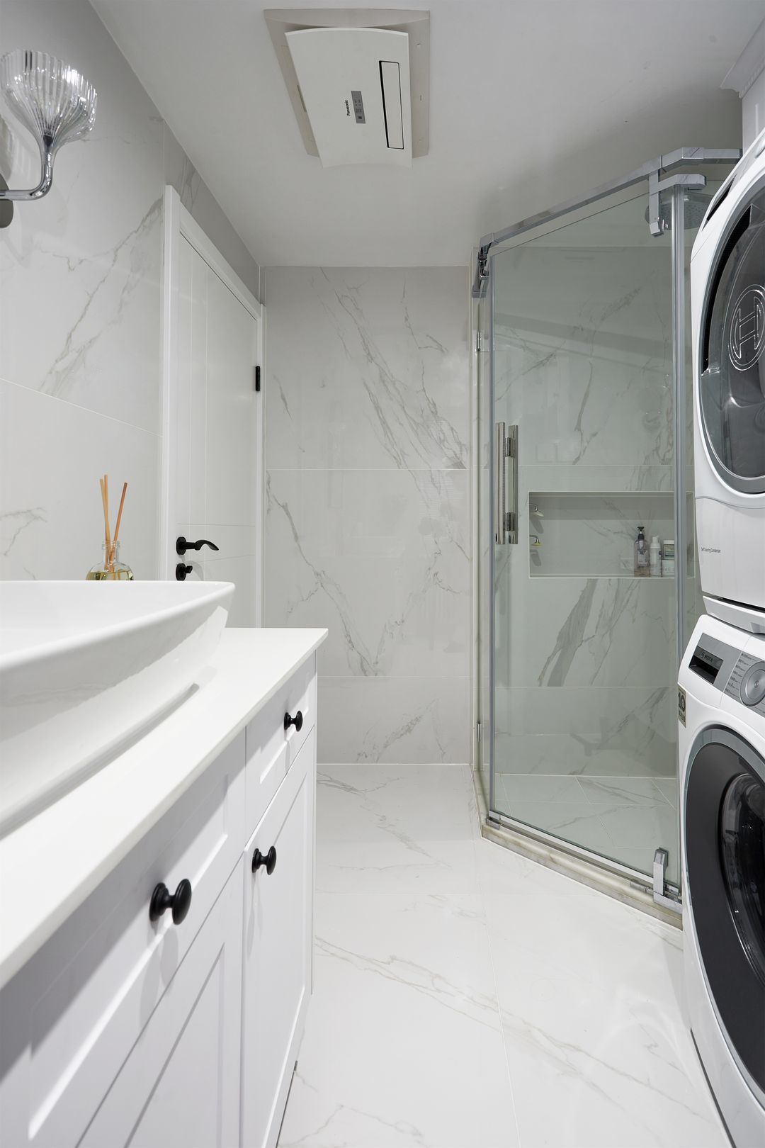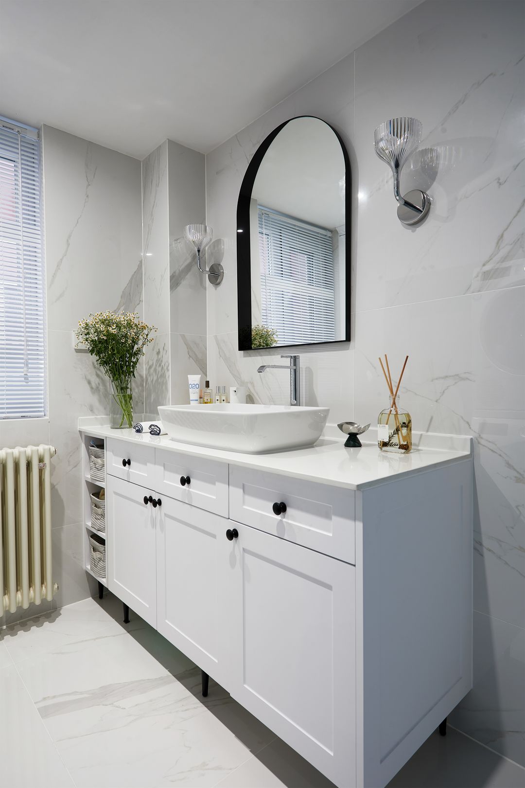 运用成品的设计思维定制了浴室柜,例如抽屉、开放格的存放以及取用,使其更符合居住者的使用习惯。