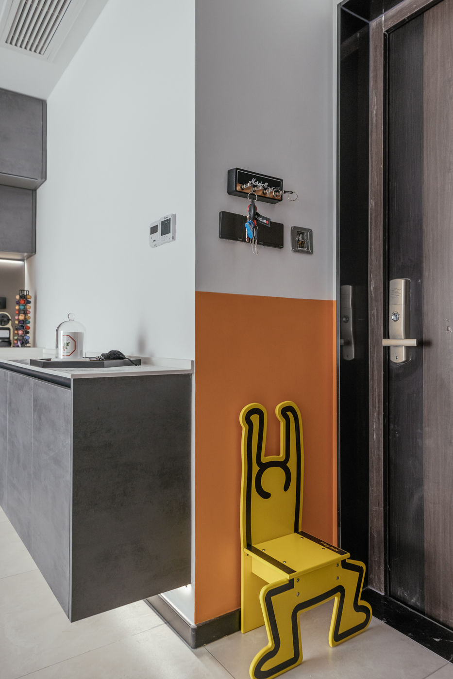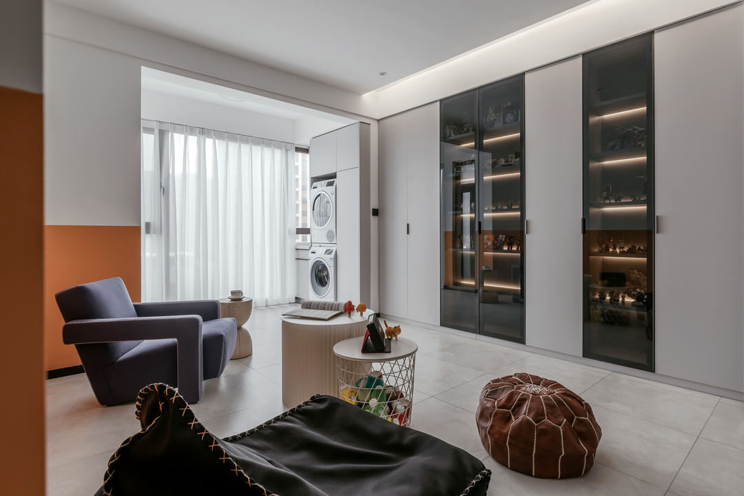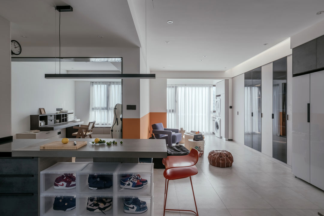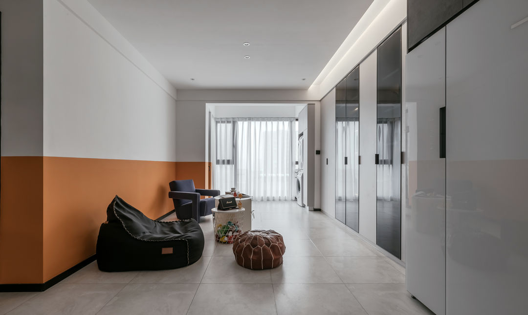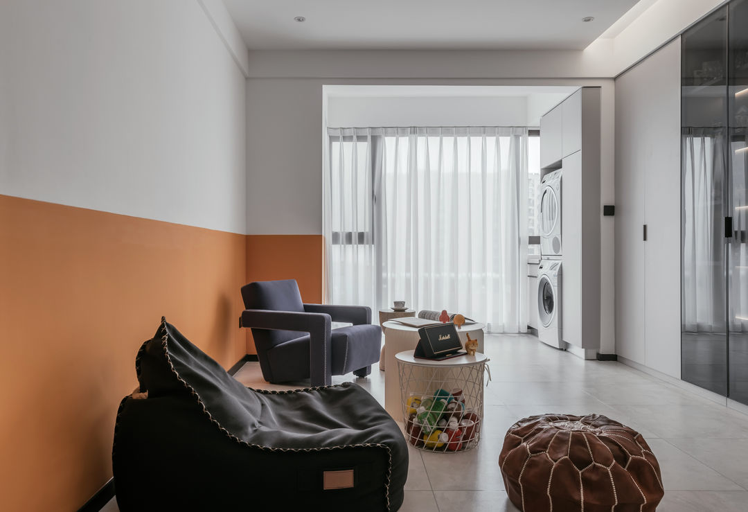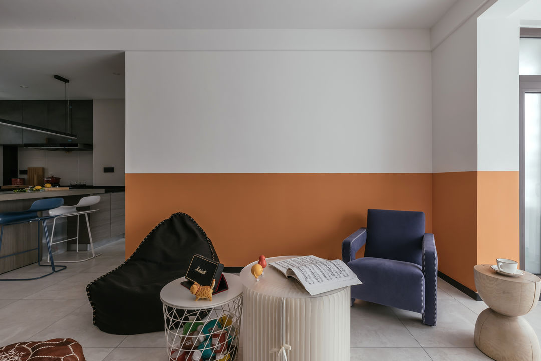 进门处亮黄色人形座椅,在主人进门时给予一个温暖的拥抱,橙色色块串联起各个功能区,成为整个空间最耀眼的笔触。