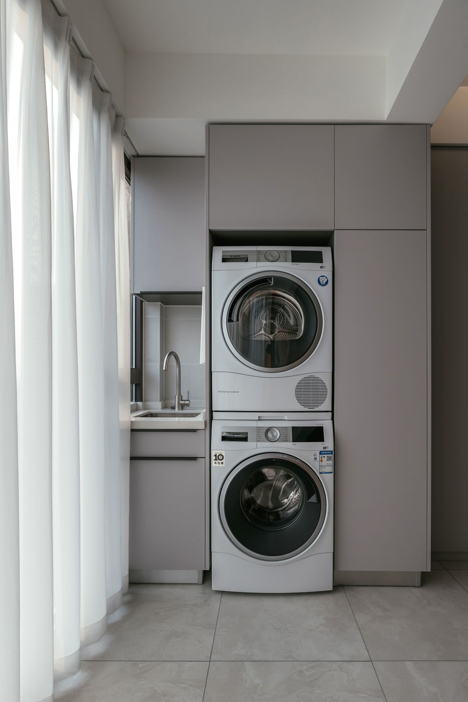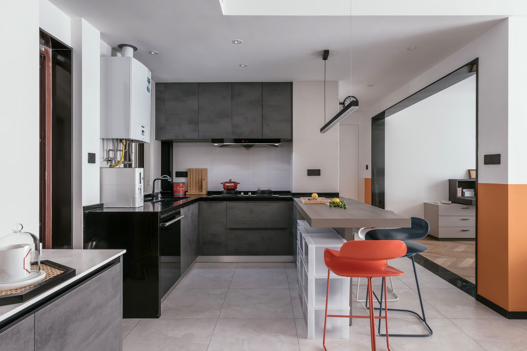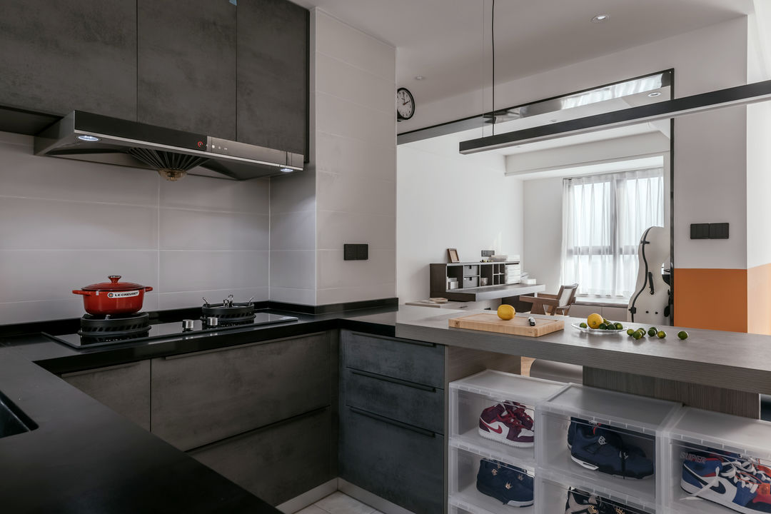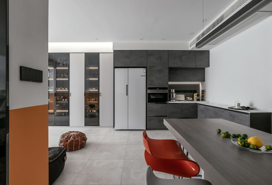 L型开放式厨房与餐厅完美衔接,木纹长桌代替墙体,与厨房围合出烟火清欢,两个空间相互连通又功能独立,让空间动线更具灵活性。