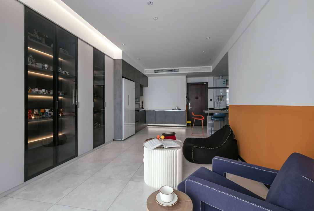 南北通透的格局、全开放式设计,营造空间的深度。展示柜里陈列着工艺品、藏书以及屋主人珍藏的手办,在灯光的映衬下,各自散发着独特有趣的艺术气息,关于它们背后的故事,在这里将会成为会友、聊天时饶有趣味的话题。