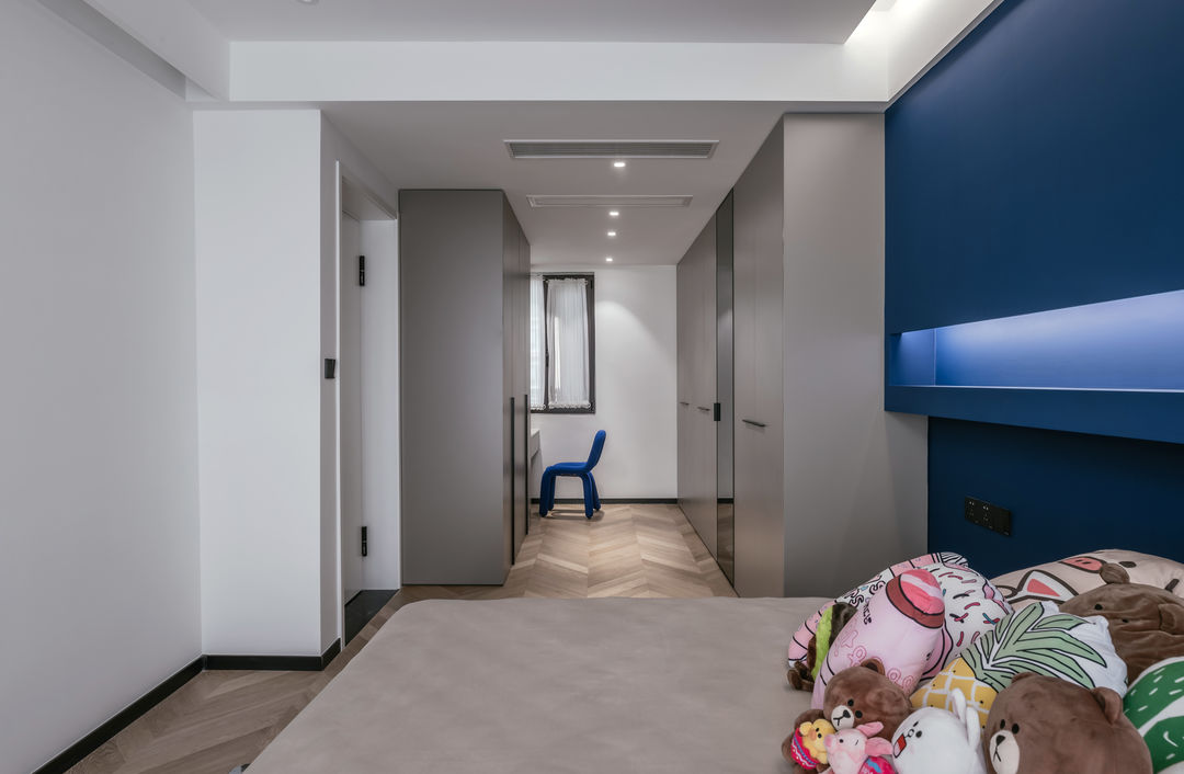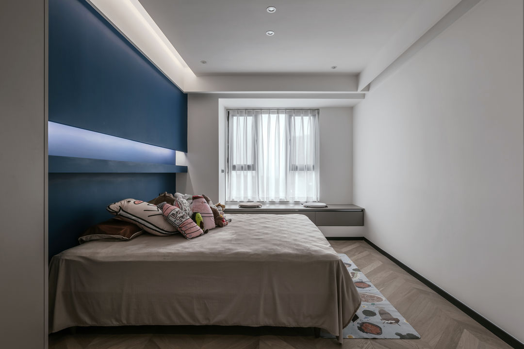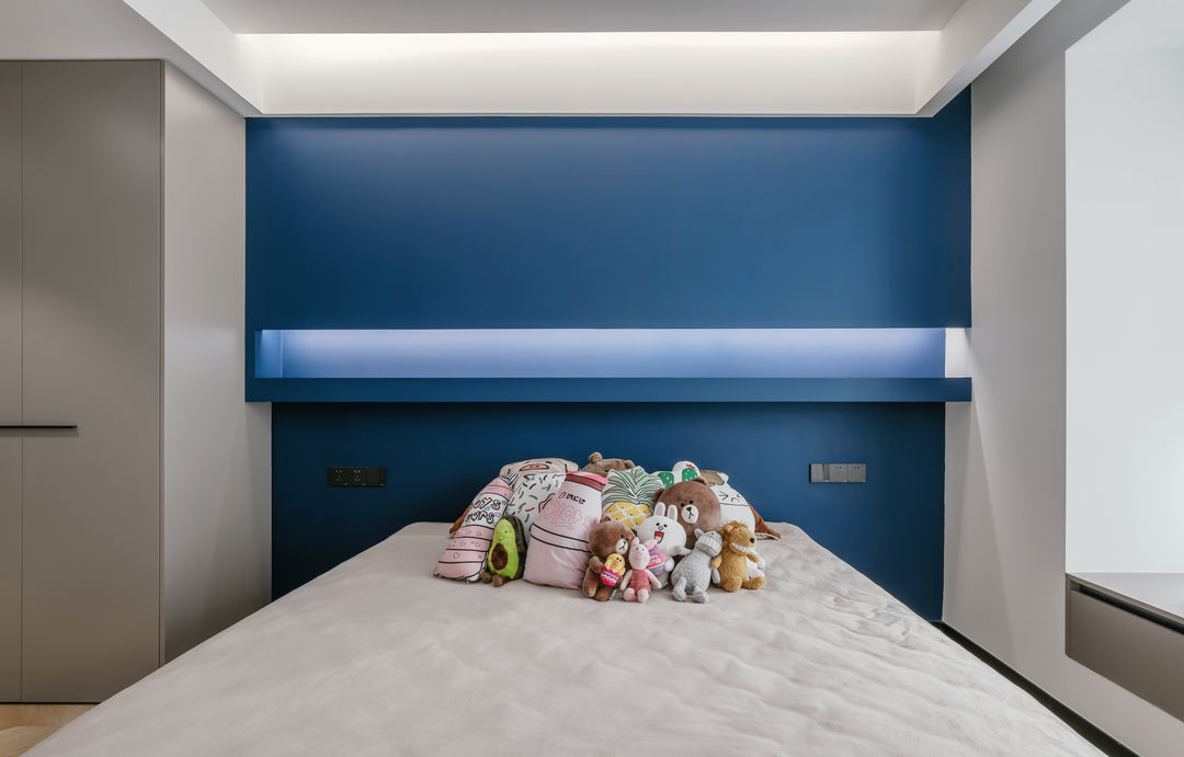 深蓝色背景与内嵌灯带结合,形成和缓静谧的睡眠空间。来自森林深处的小动物公仔们挤在床头,在每一个深夜给予温暖的拥抱与陪伴。