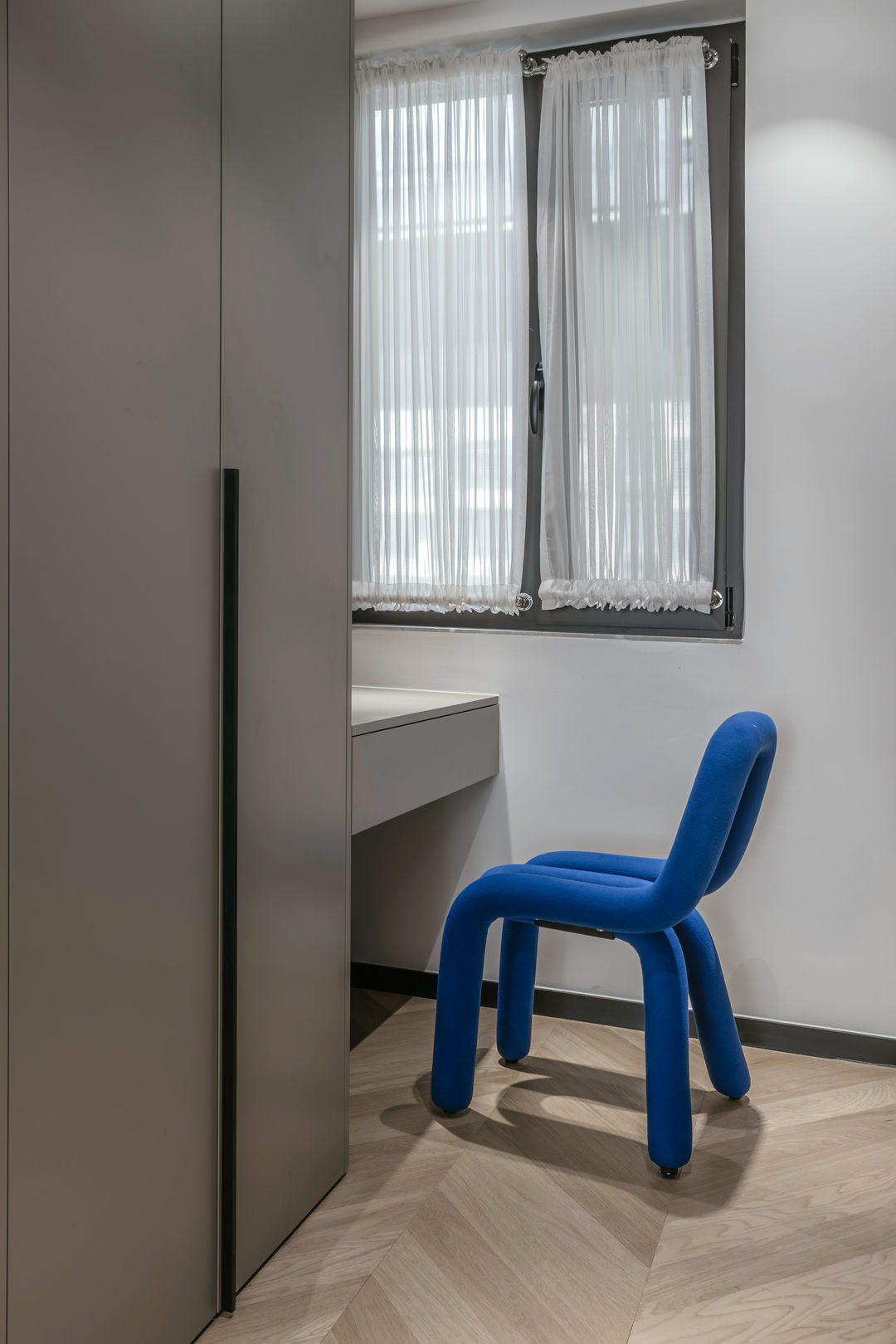 餐椅设计极具线条感,简洁而大气;跳跃的色彩协调整体空间氛围,形式与色彩配合,赋予空间新的感知。
