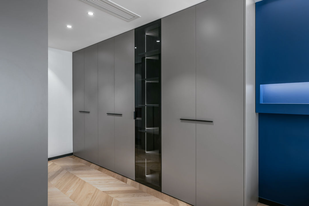 衣帽间定制橱柜兼具实用性与美观性,深色玻璃材质映射灯光,带来精致的视觉观感,多而杂乱的衣物鞋帽得以有序的安放,刻画优雅舒适的起居生活。