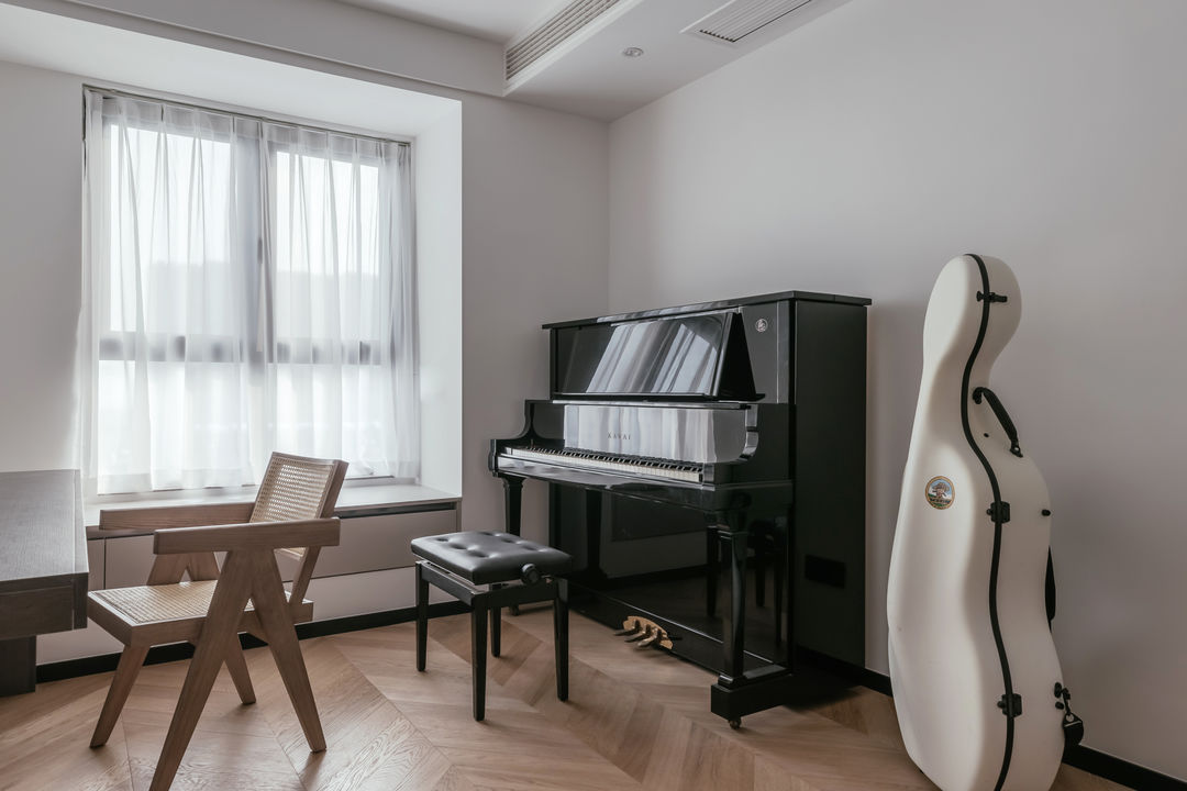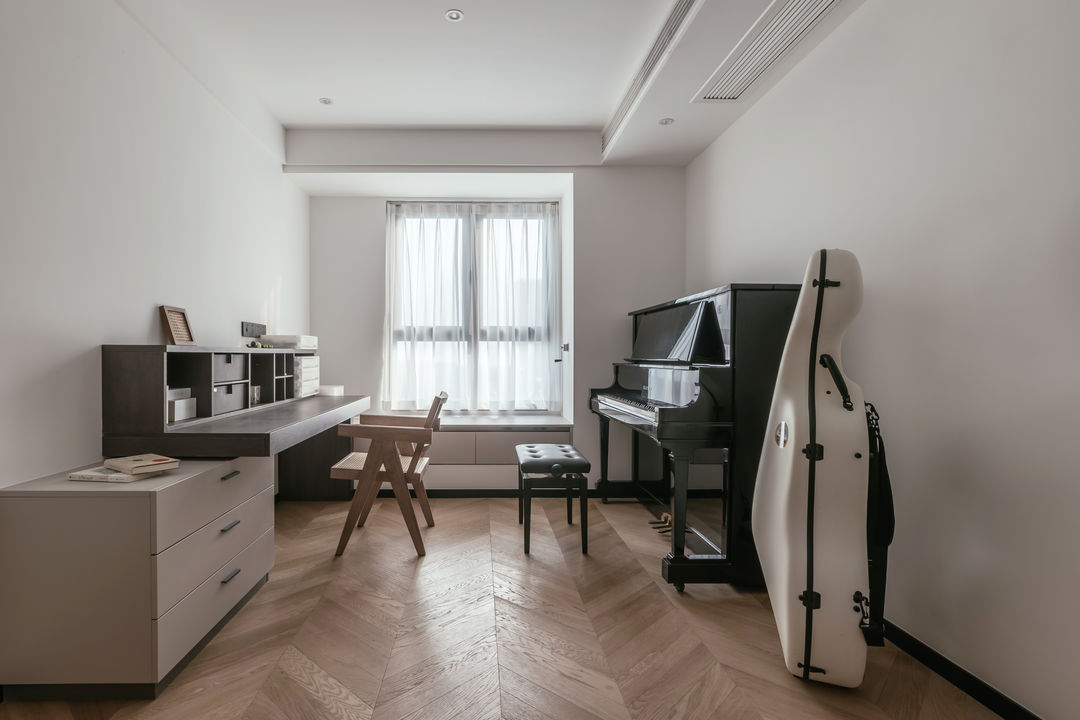 地面运用鱼骨造型的装饰,铺叙出温暖和谐的秩序美感,轻柔的钢琴乐抚慰心灵,配合温煦的阳光,融合出岁月静苒的美好画幅。