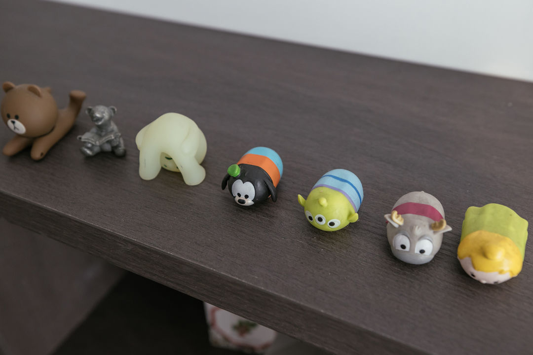 书桌上方聚集着形态各异的小动物摆件,看似可爱的、慵懒的、逗趣的、好学的,散发出悠闲而自在的生活气息。