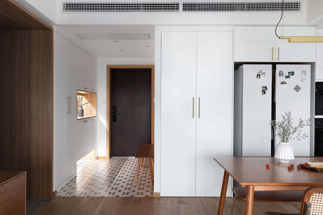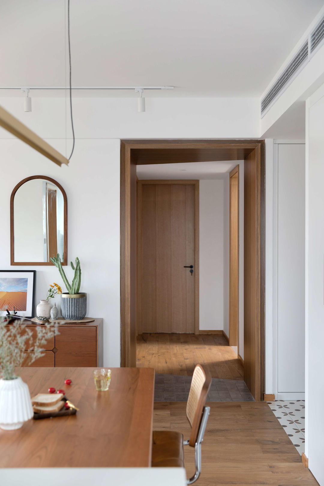 ▲一进门就有一种远离闹市的感觉,木质材料占据大部分的视野,仿佛能闻到原木的清香,整个人都放松下来。玄关柜上一束迎宾小花,让人心生喜悦