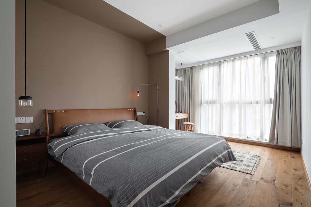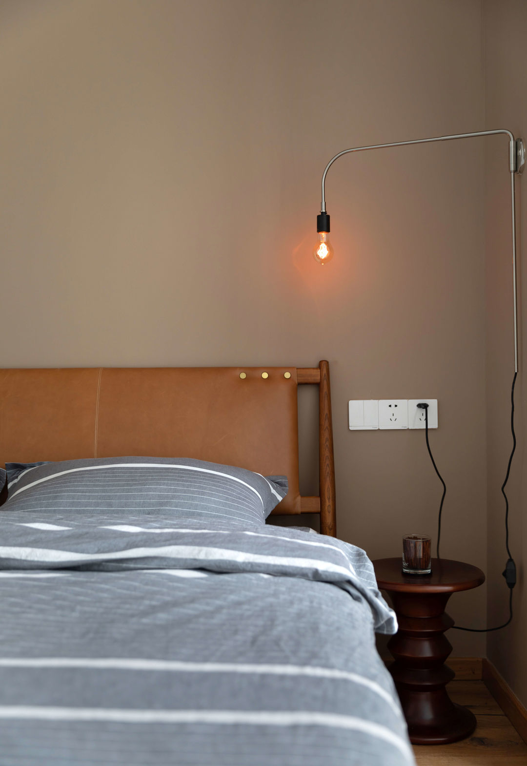 ▲主卧延用木质家具,驼色墙面搭配皮质床屏和素雅的条纹床品,营造了舒适温馨的睡眠气氛