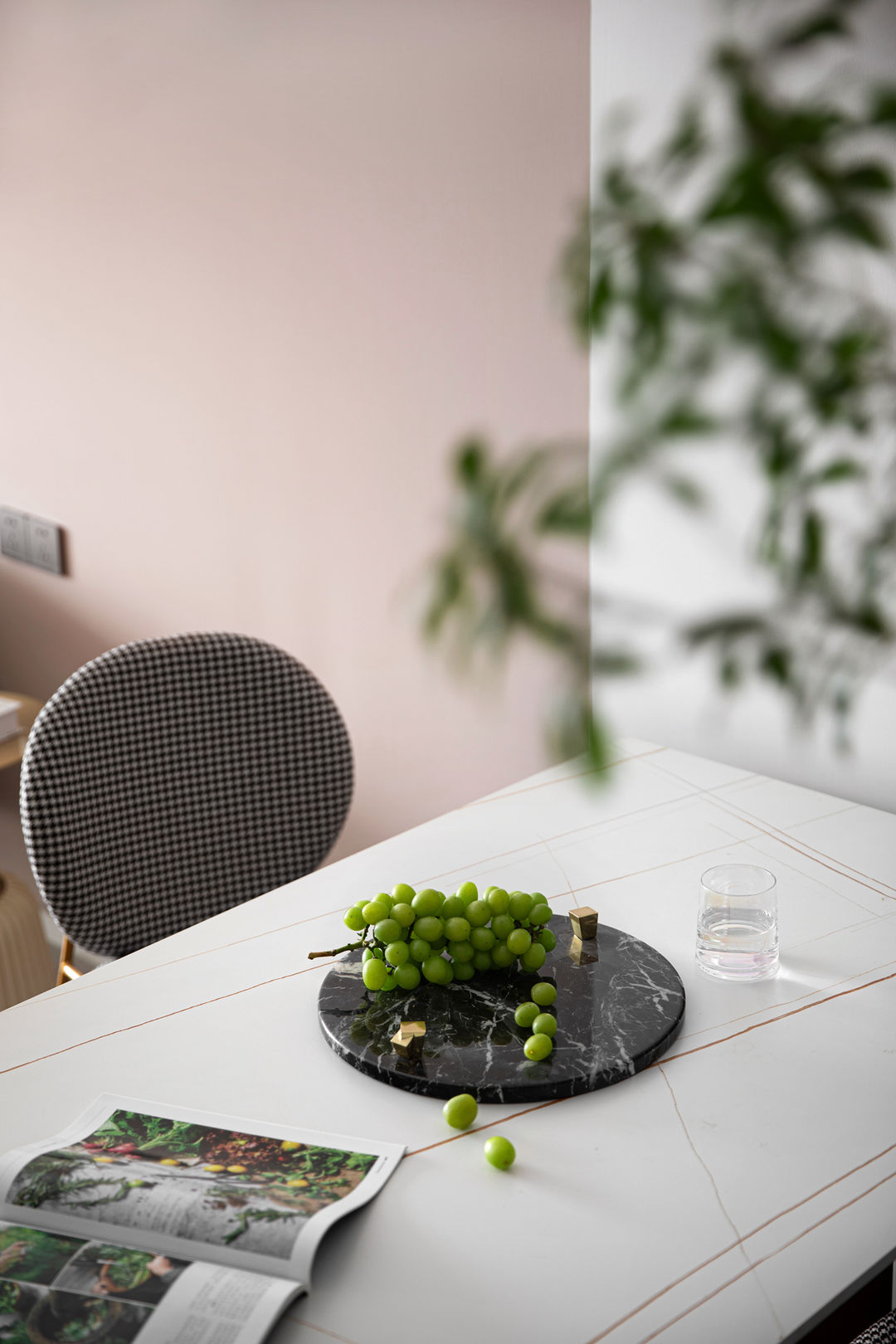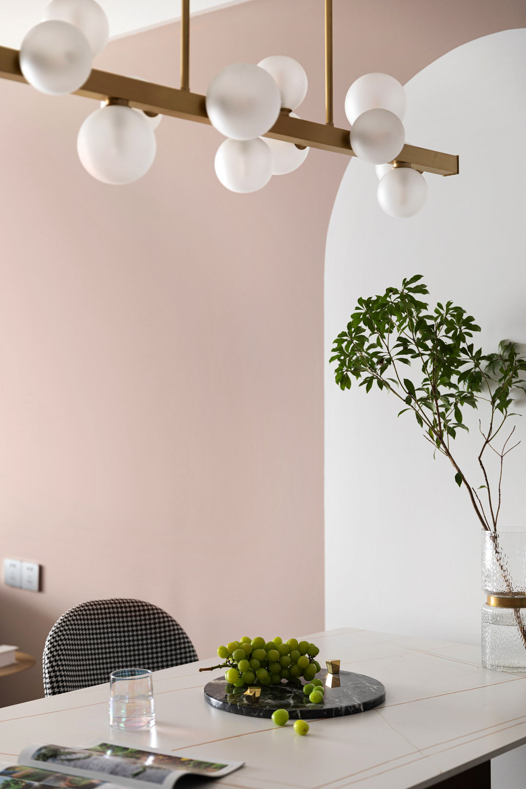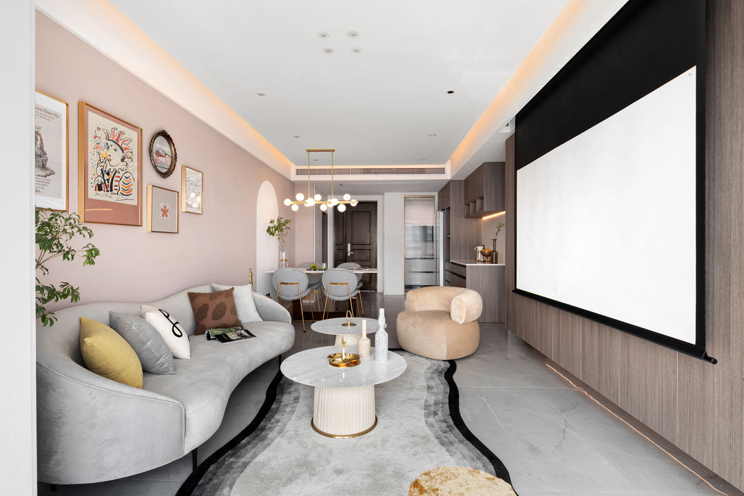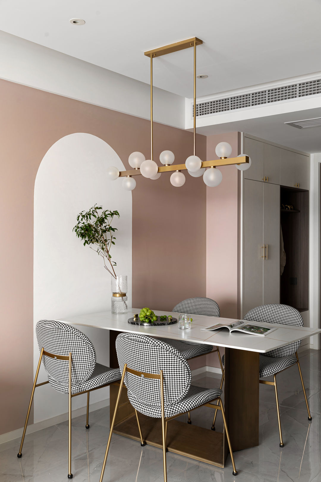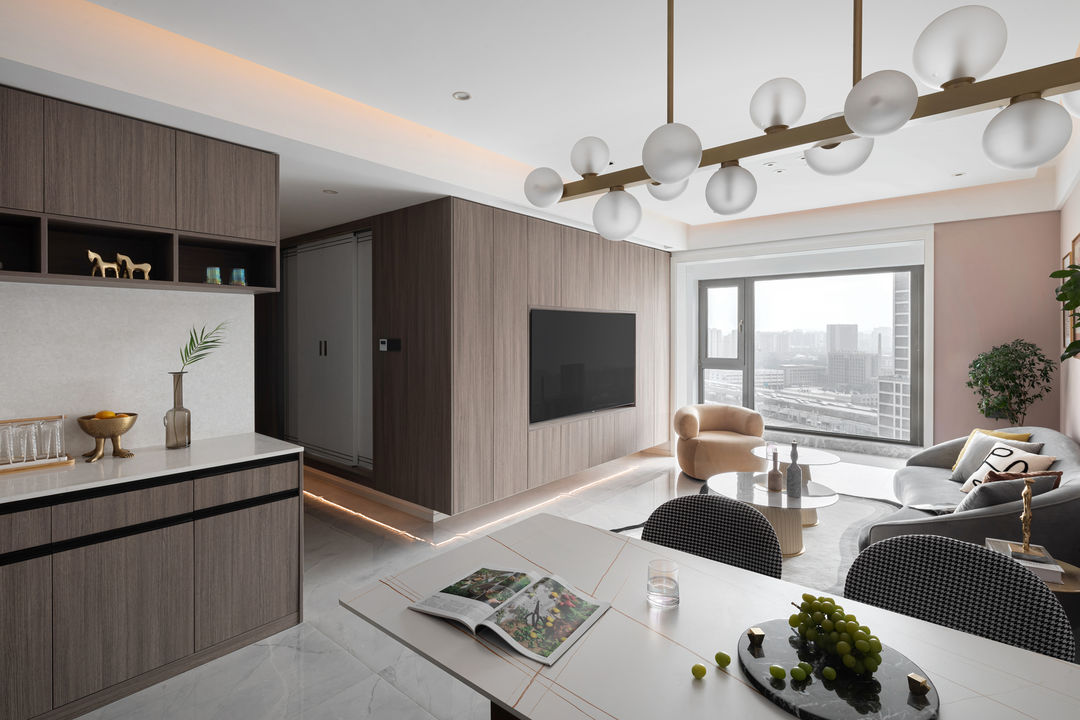 其它空间都是无主灯的设计,唯独在餐桌上留了一盏吊灯,增加浪漫轻奢的氛围感,打到食物上也可以让美食更加诱人。