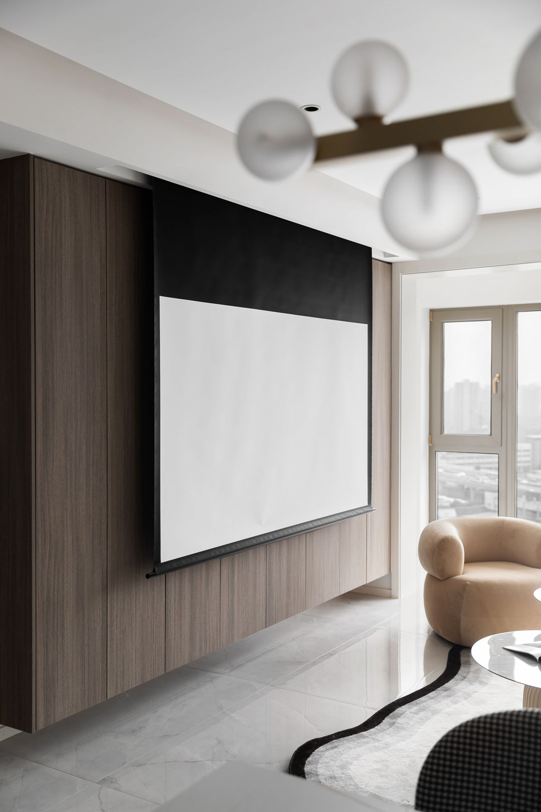 可升降式投影幕布,不用时可以收起,放下时就是私人影院,电视和投影随意切换。