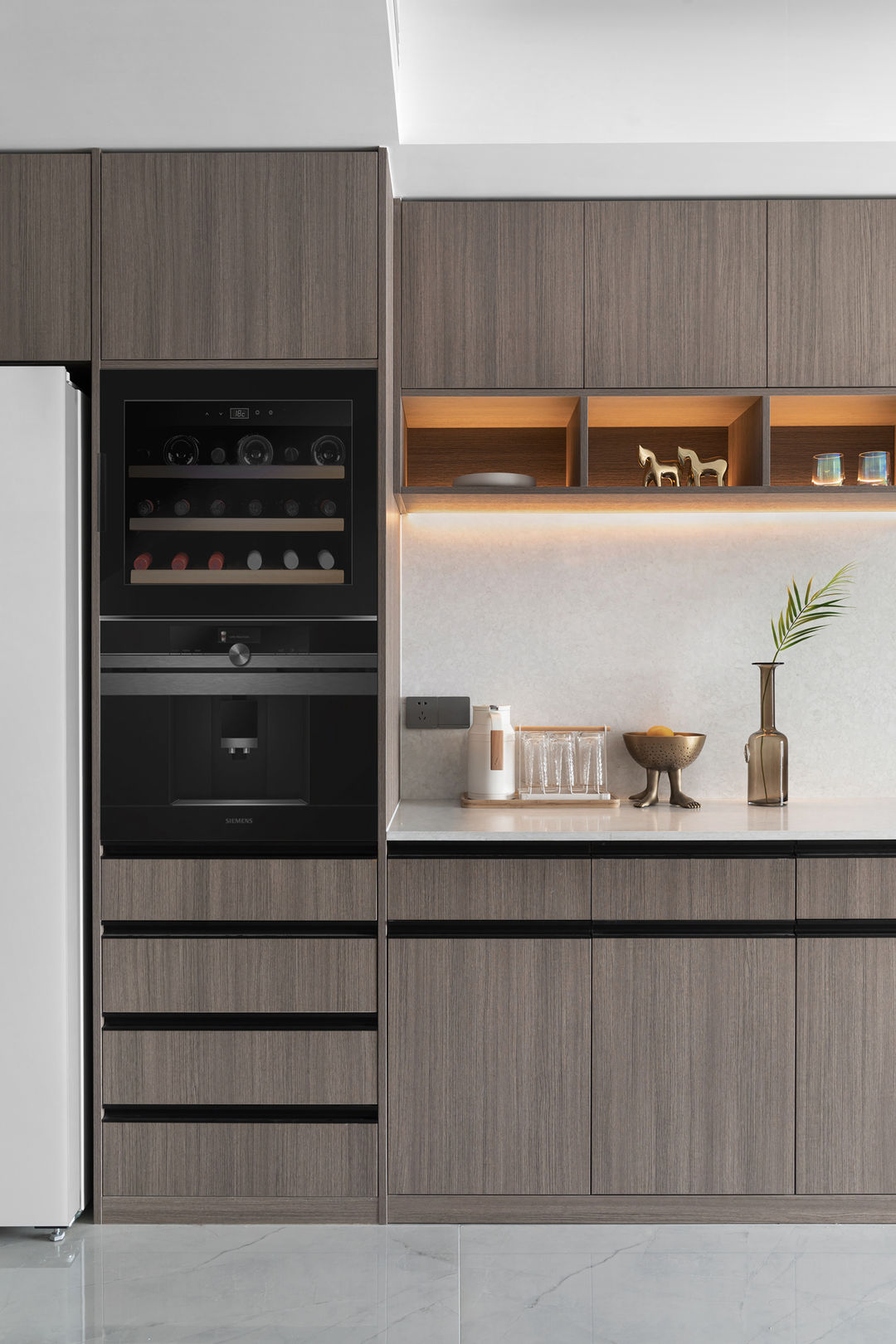 冰箱、蒸烤箱、酒柜都放到了西厨区,收藏的食器可以放在开放格里作为摆设。台面下的抽屉还做了暖抽,看似普通的柜子功能满满。