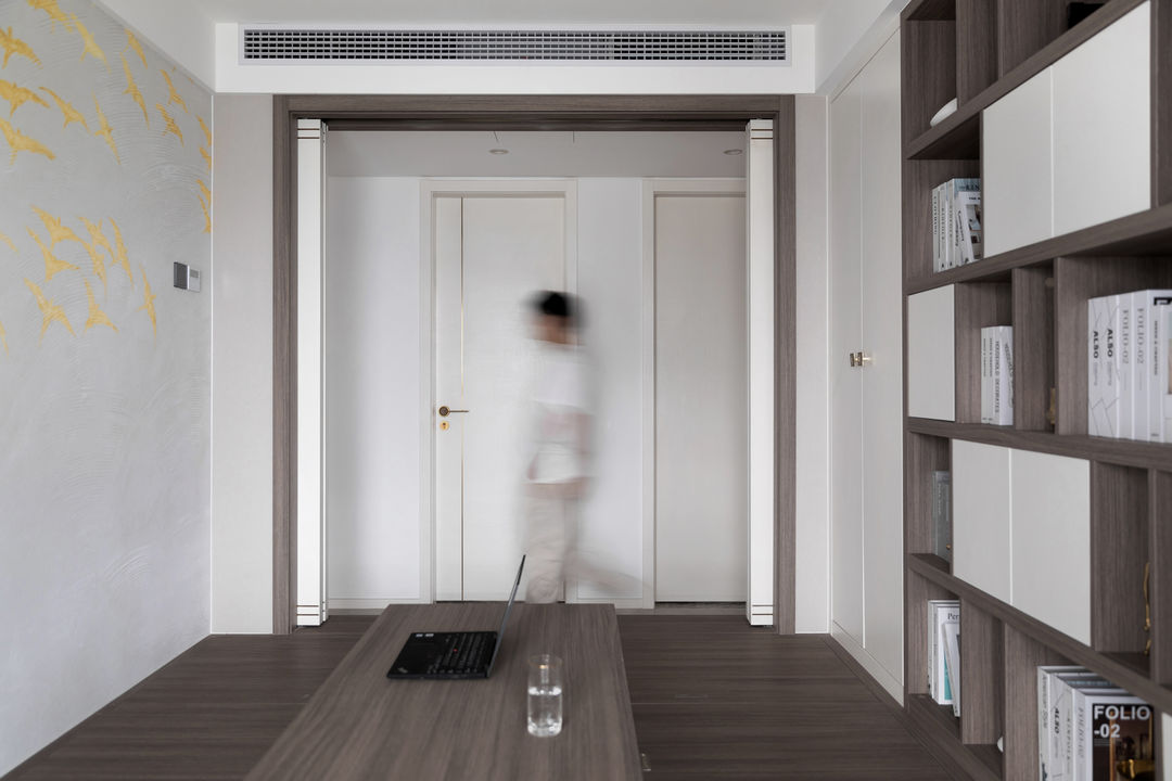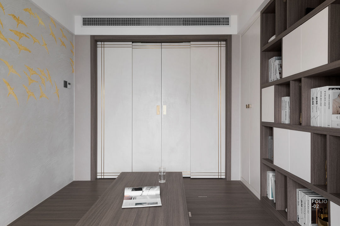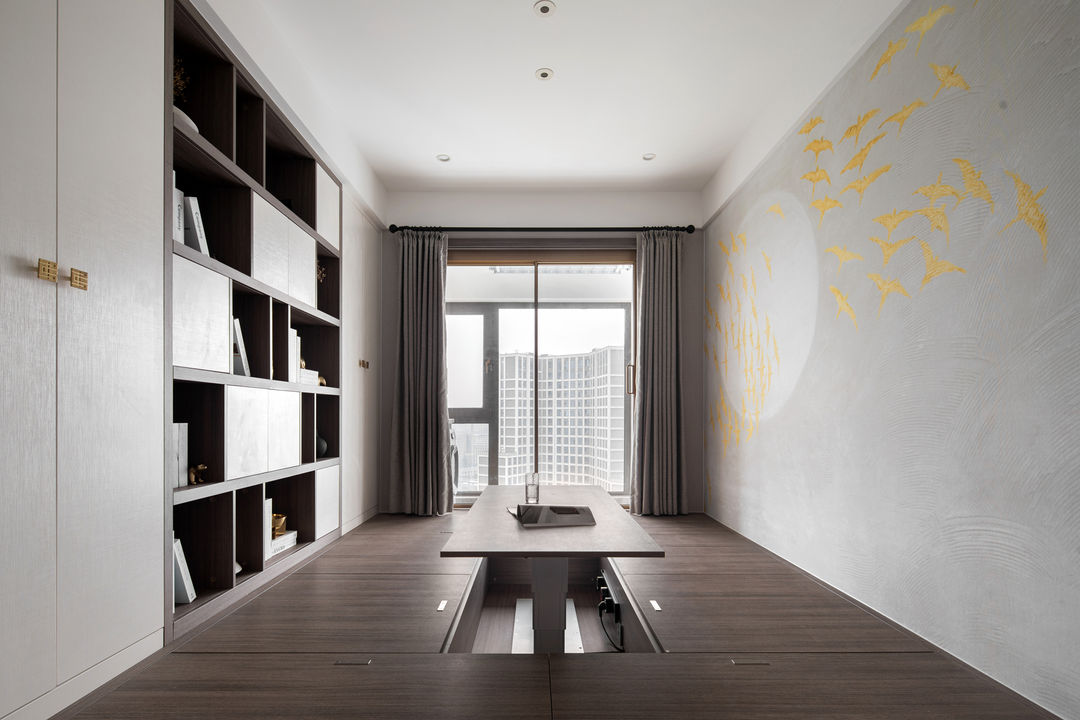 可升降榻榻米台,喝茶办公一般都在榻榻米房解决,把柜子里的被褥拿出来一铺,房间又秒变客卧。