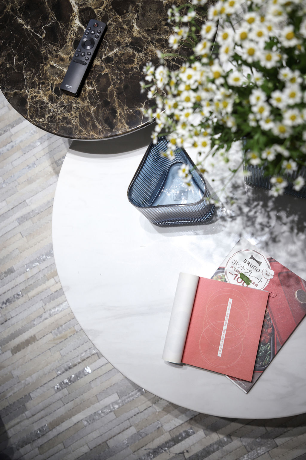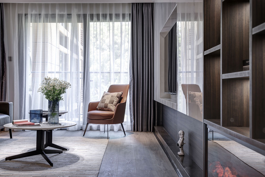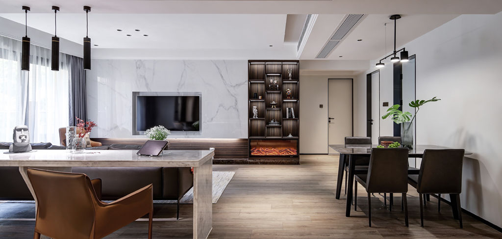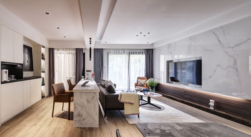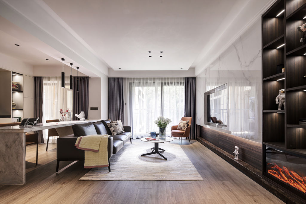 电视背景墙由大理石纹瓷砖+尤加利木饰面板+电子壁炉构成,无论是居家日用,还是待人接客,都不失典雅大气。右下角电子壁炉的火光纯粹热烈,迷醉了在家的一段温软时光。