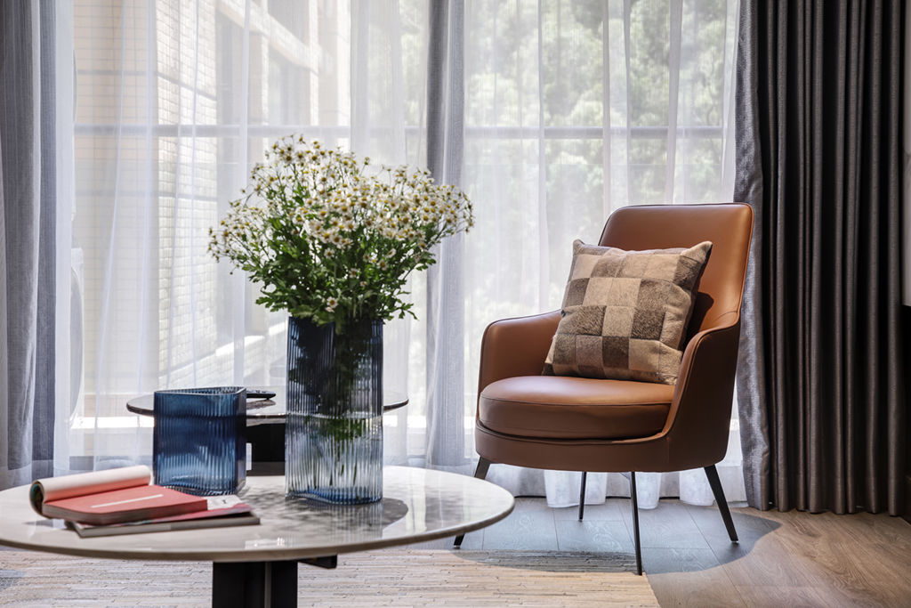 一眼看去,极细的不锈钢门套俨然成为了简洁有设计感的墙面几何造型,与现代极简主义家具直落的线条美感,遥相呼应。