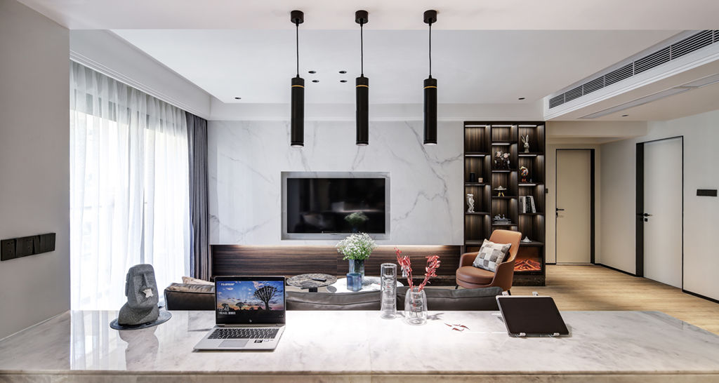 沙发背后的区域可视为开放式书房,大理石吧台为办公台,可供两人同时办公、打游戏使用。其后是黑白色的到顶收纳柜,色彩与空间相互呼应,视觉上也拉伸了空间高度,既独立又统一。