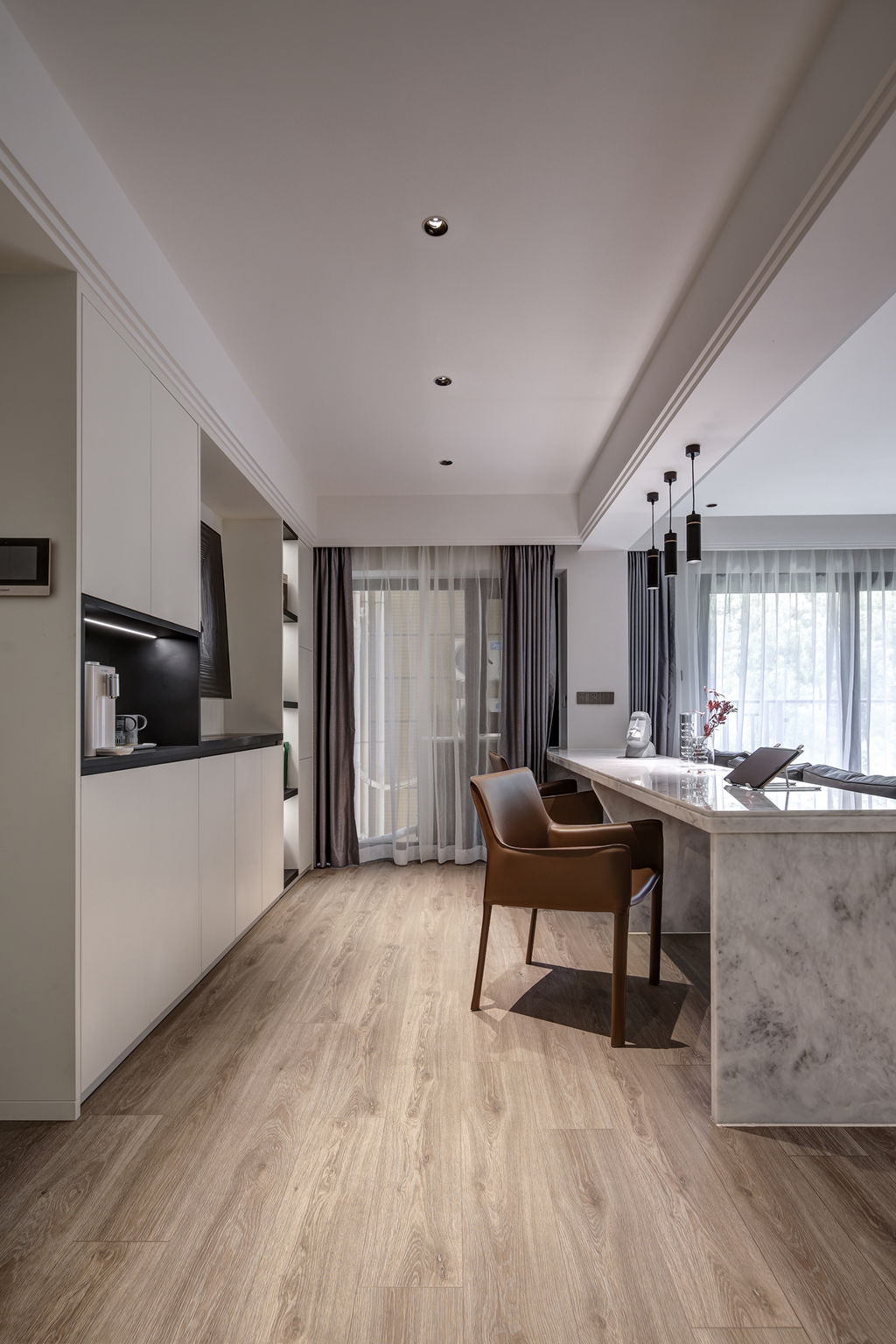 设计师根据业主需求,将设计聚焦于格局的优化和细节的打磨,将当下与未来几年的生活轨迹综合考虑,解放书房独立性,让公共区域得到多方向的延展,最大化采光通风,同时,利用柜体处理原户型缺陷,增加收纳空间的同时让室内空间更加规整有序。