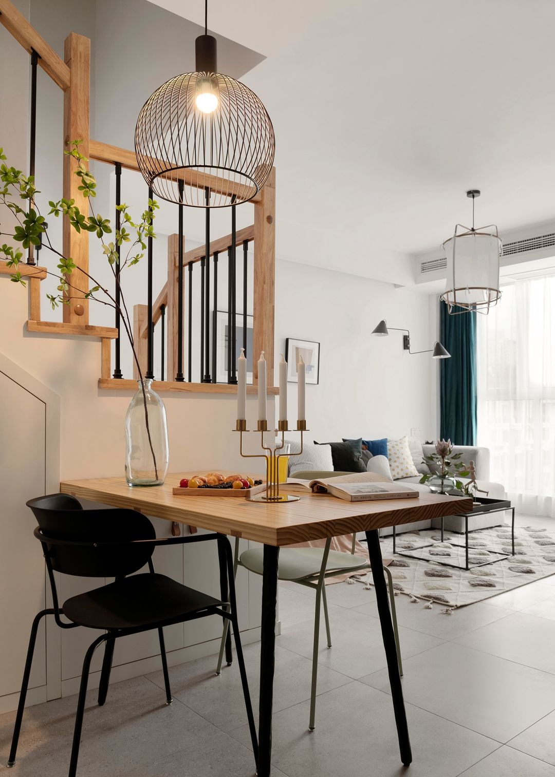 重新洗牌的户型,客厅开放式空间,延展性的楼梯是二楼与一楼的延伸动线,楼梯下方作为一楼的收纳位置。