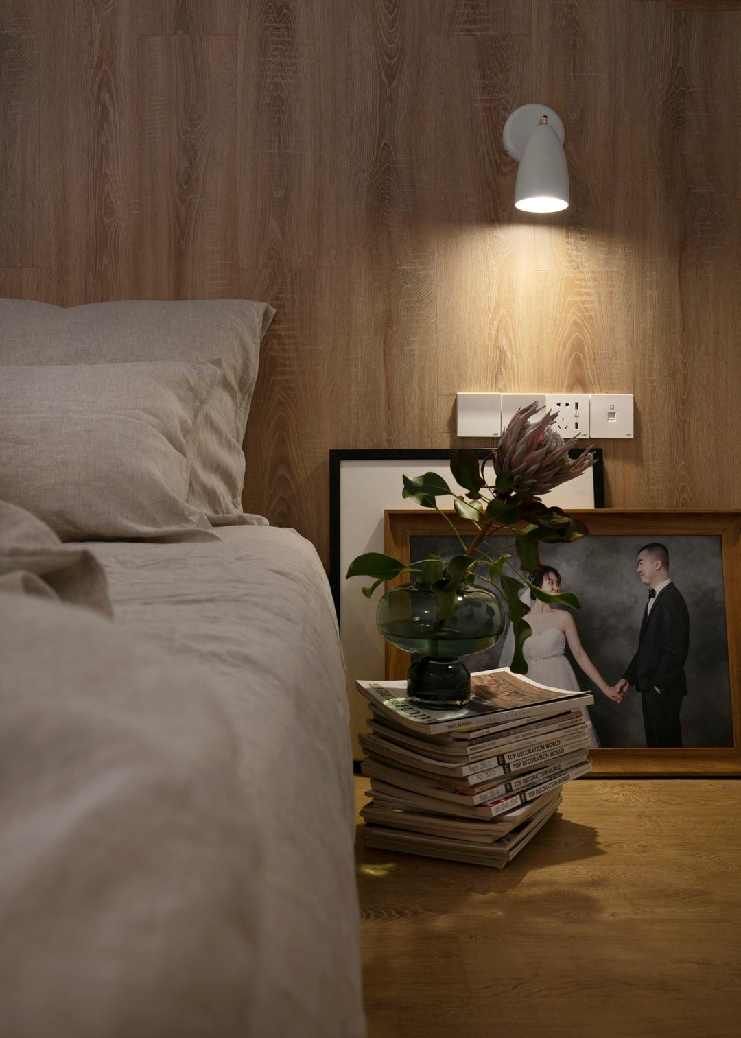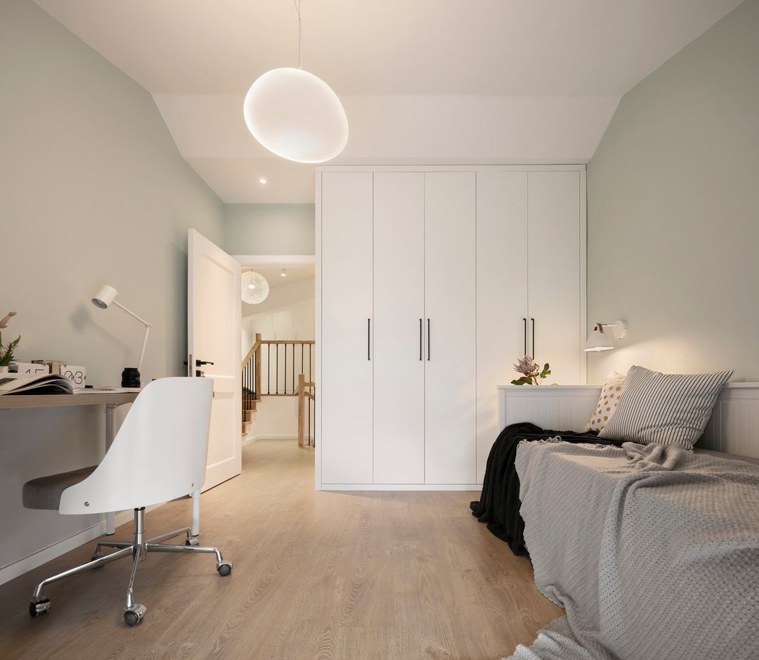 楼上卧室的最低点为一米八五,放弃传统卧室做法,采用地板上墙做靠背,定制的床架,一样效果很好,宜家的灯光效应非常好。