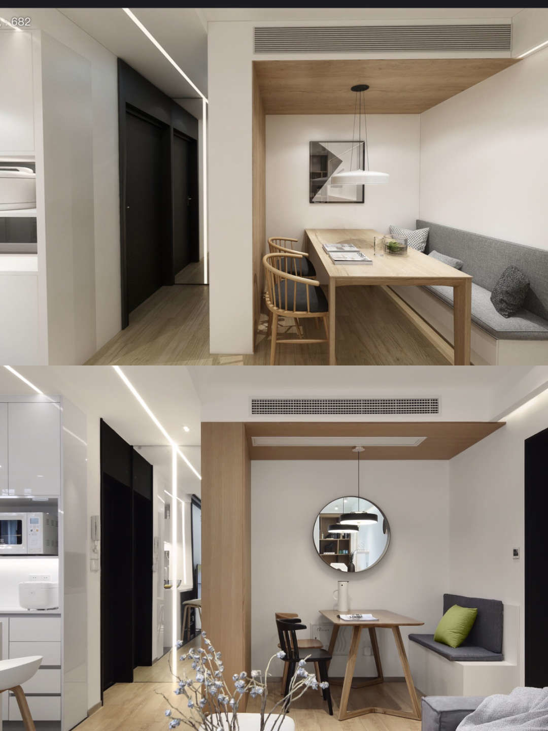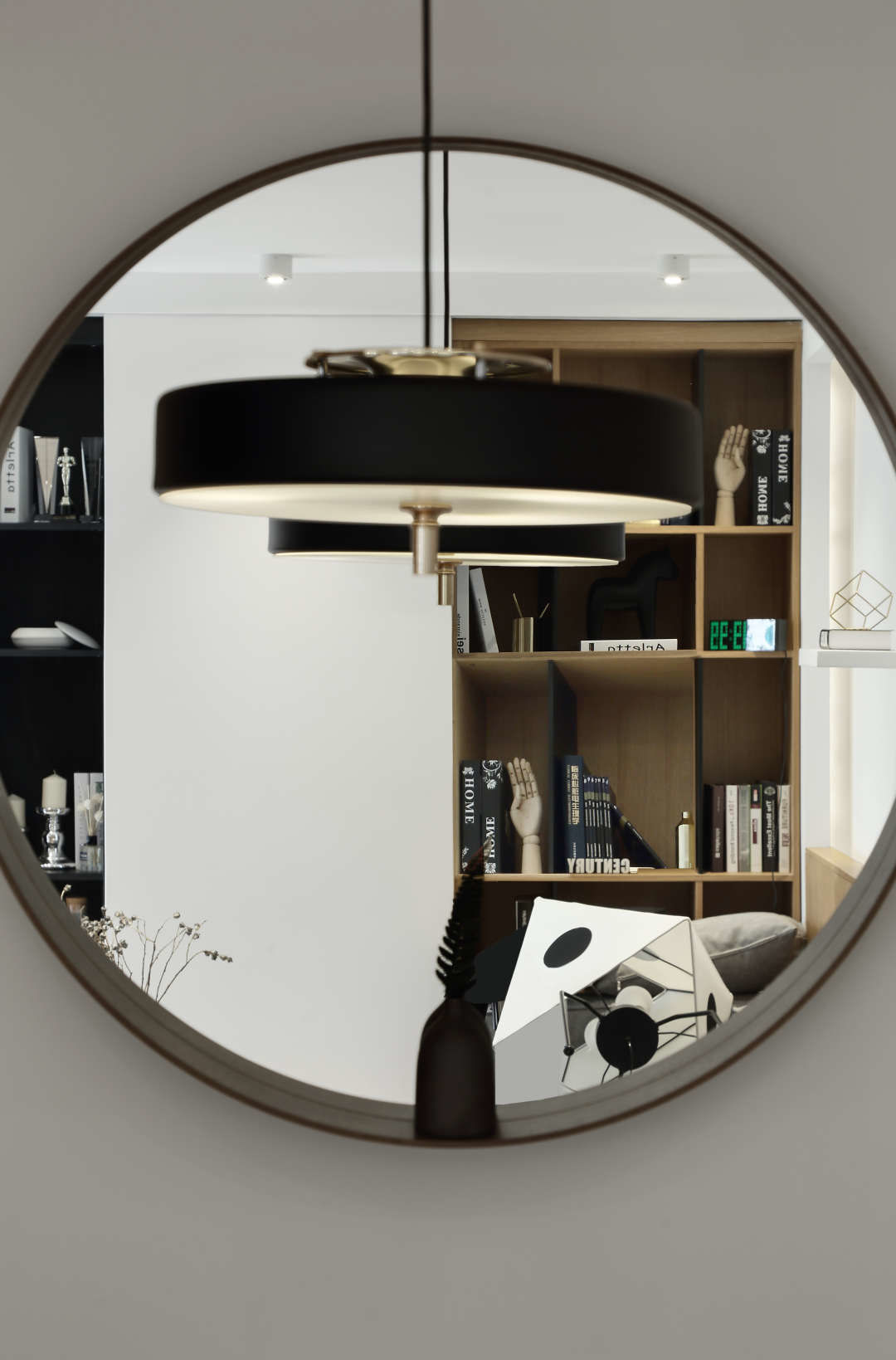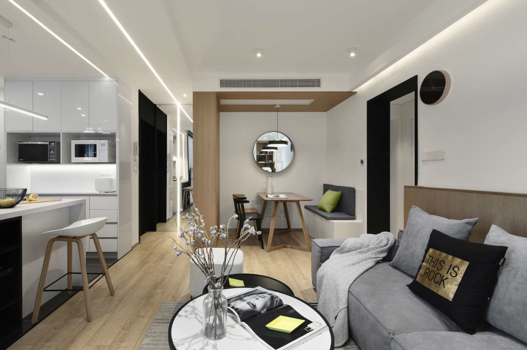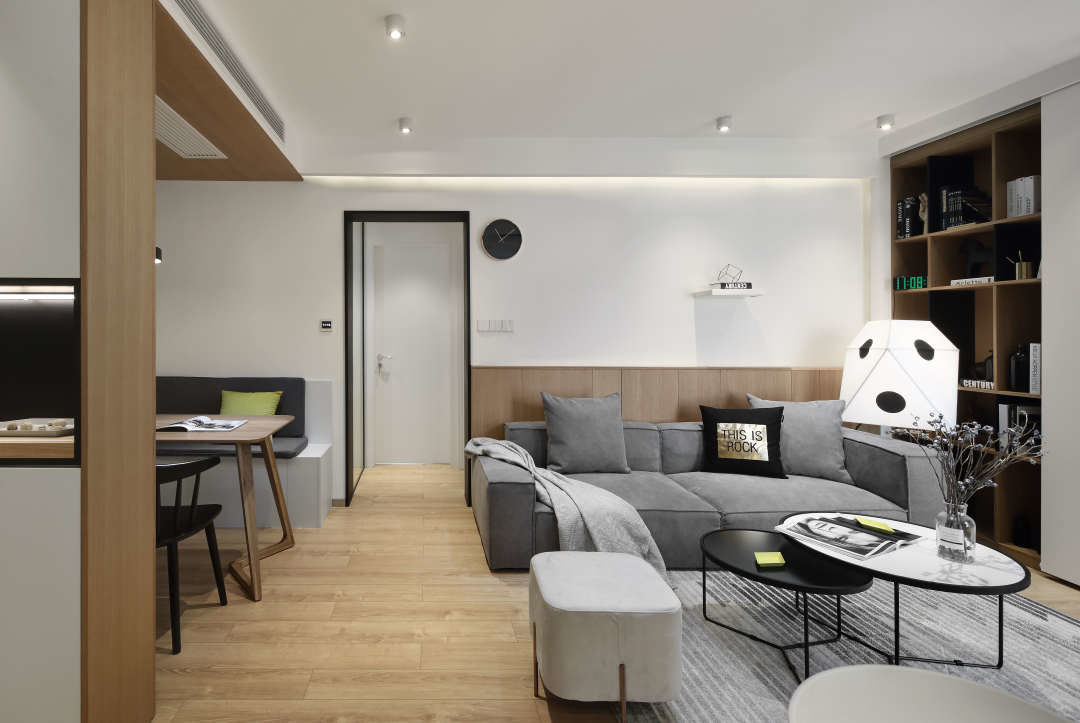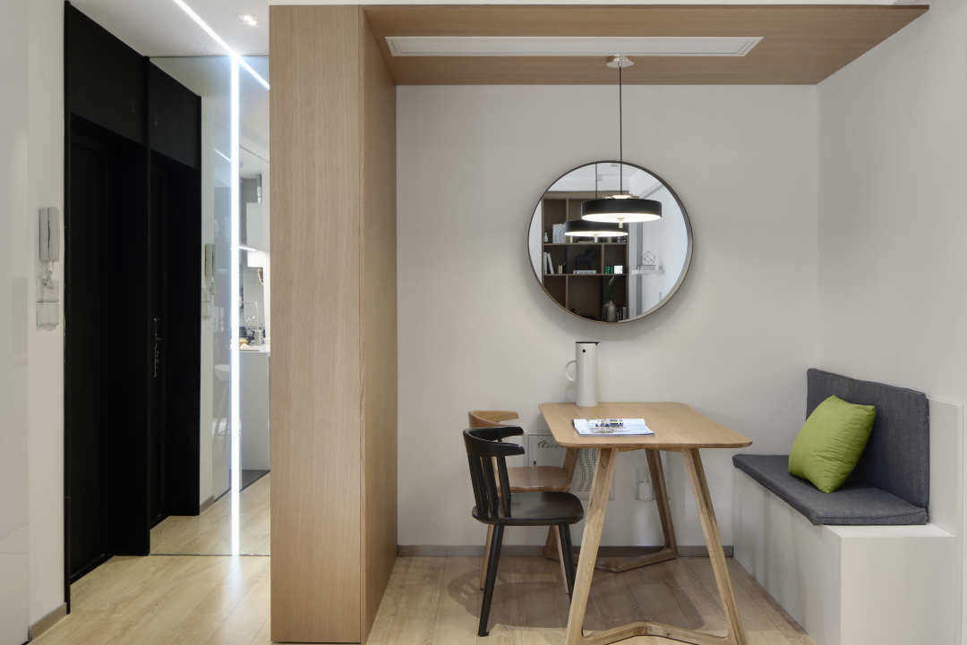餐厅区域为了节省空间增加储物,做了卡座.围合型的木饰面,让整个餐厅区域更具立体感.餐桌上的圆形镜子,给餐厅的白色墙面起到了画龙点睛的作用.镜子映射的客厅的书柜,让白墙显得非常丰富.