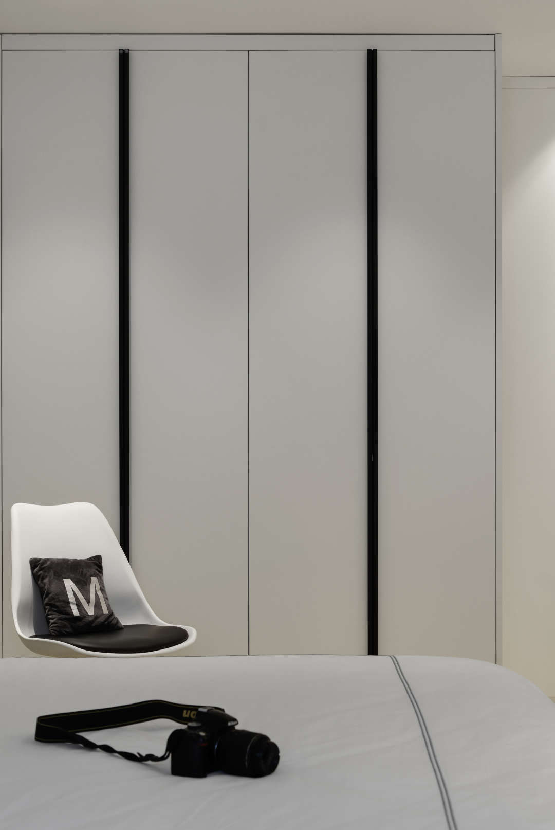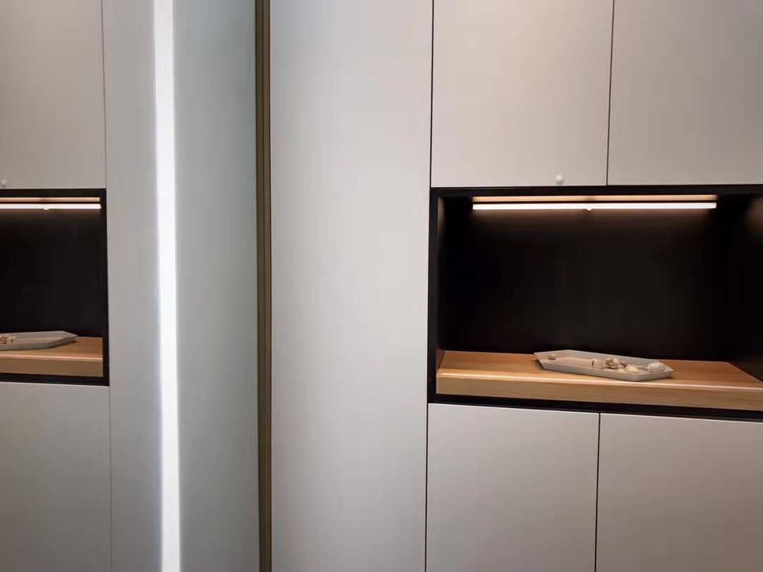 衣柜面细节,黑色线条把手,拉伸整个立面的层高.柜门是白色哑光亚克力.质感也非常好.