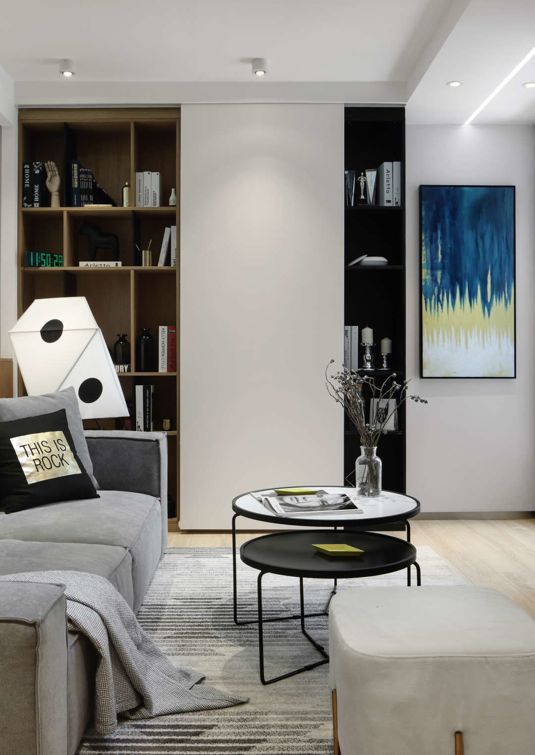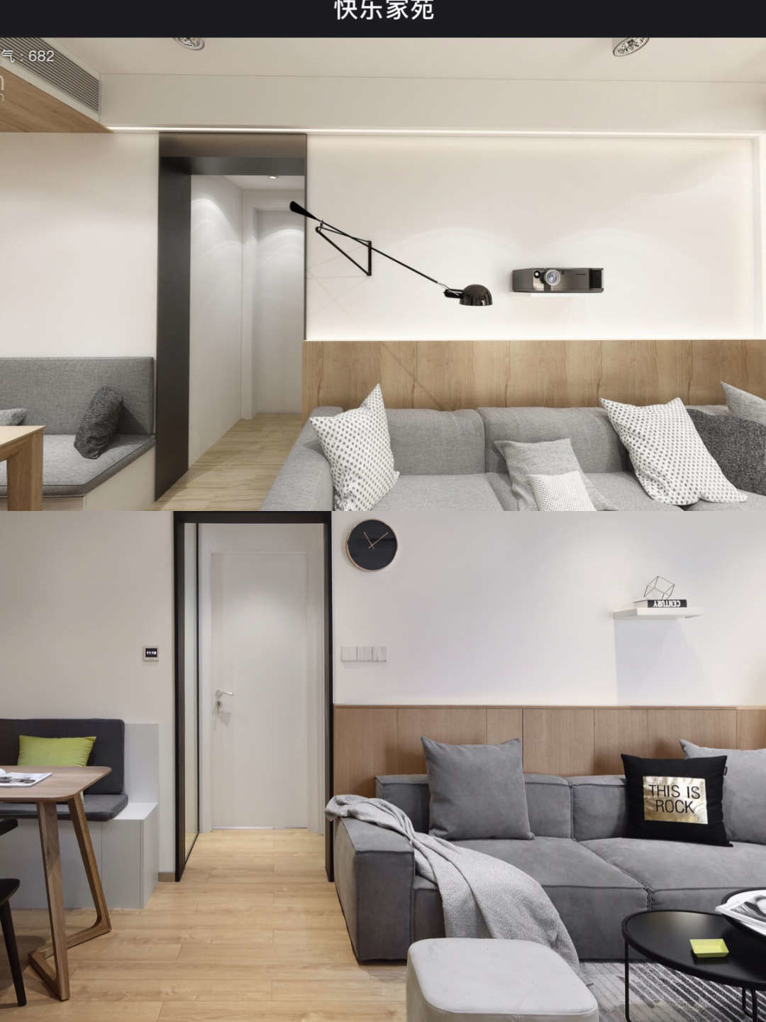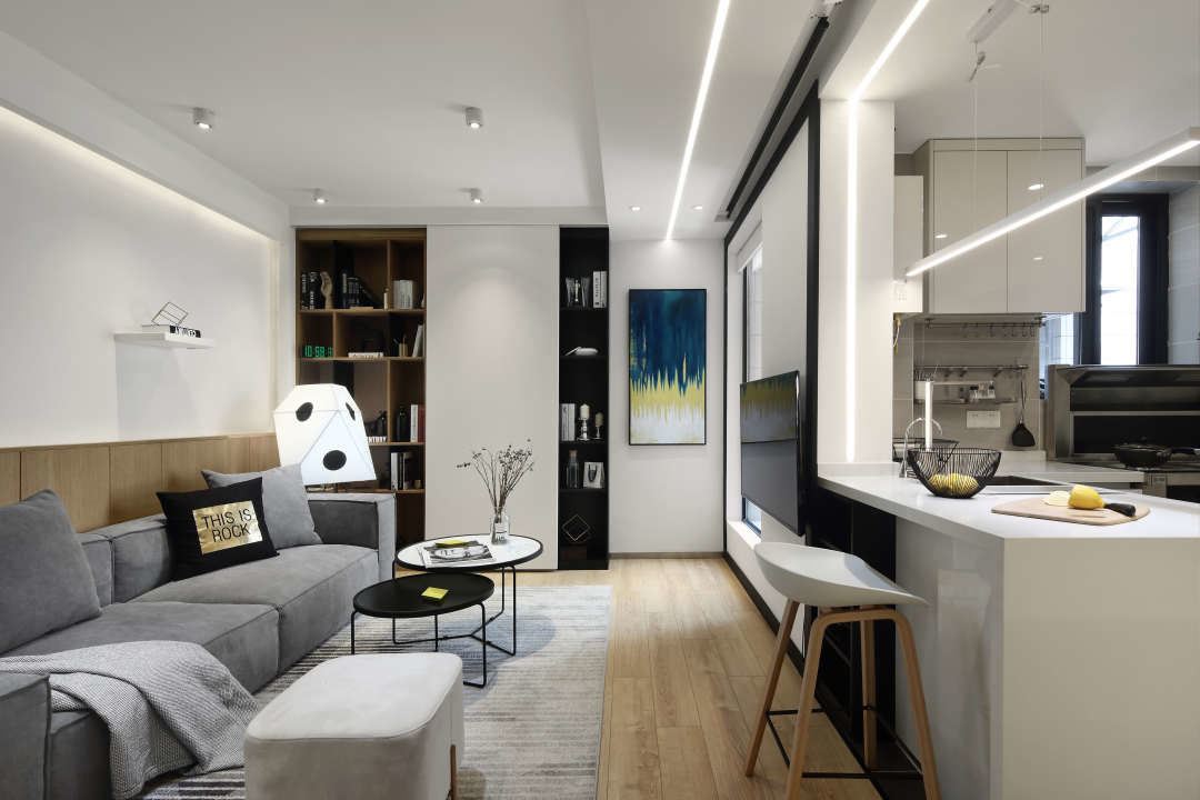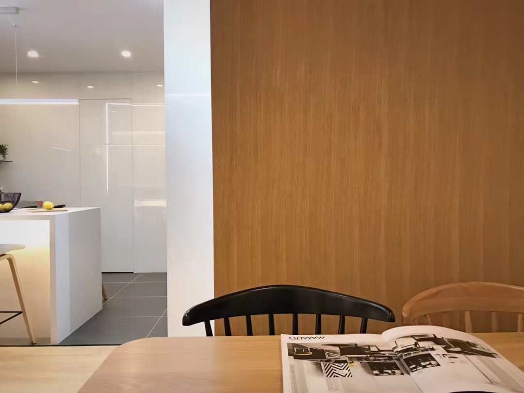 沙发墙有个白色架子放书的地方是之后用来放投影仪的.沙发背后用了半面木饰面墙,里面藏了灯带,从左边墙面延伸到顶面,呼应进门口和厨房吧台处垭口的L形线条灯光.进入房门的垭口用了黑色不锈钢套.