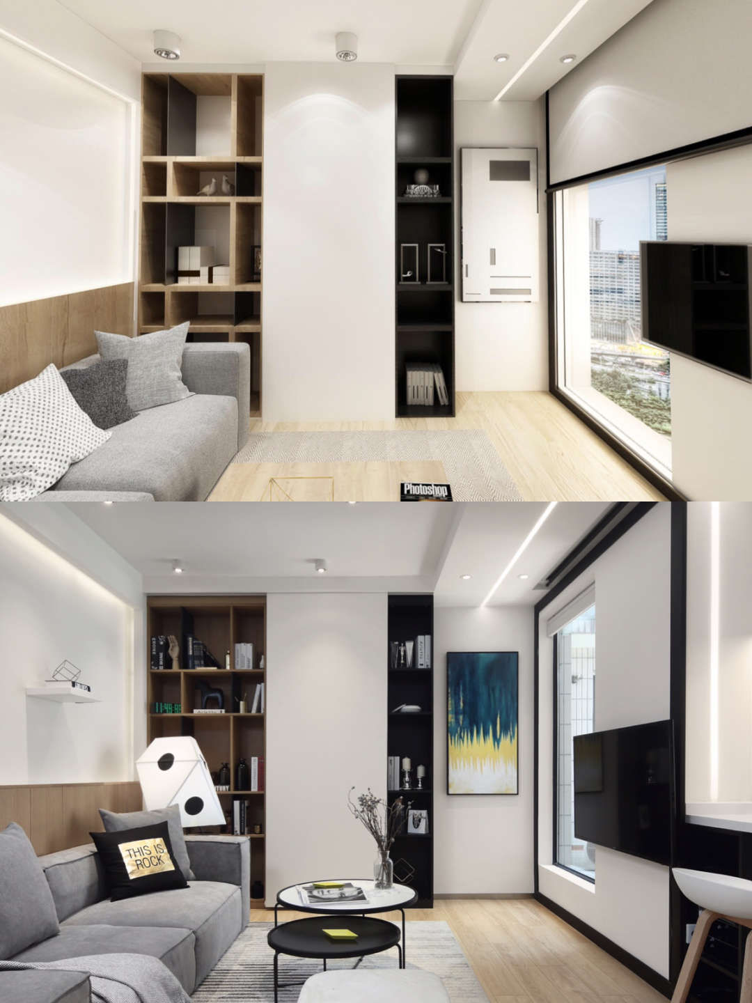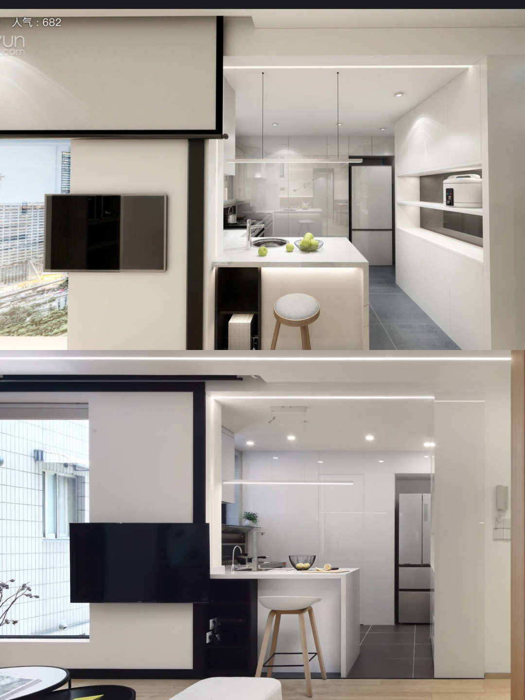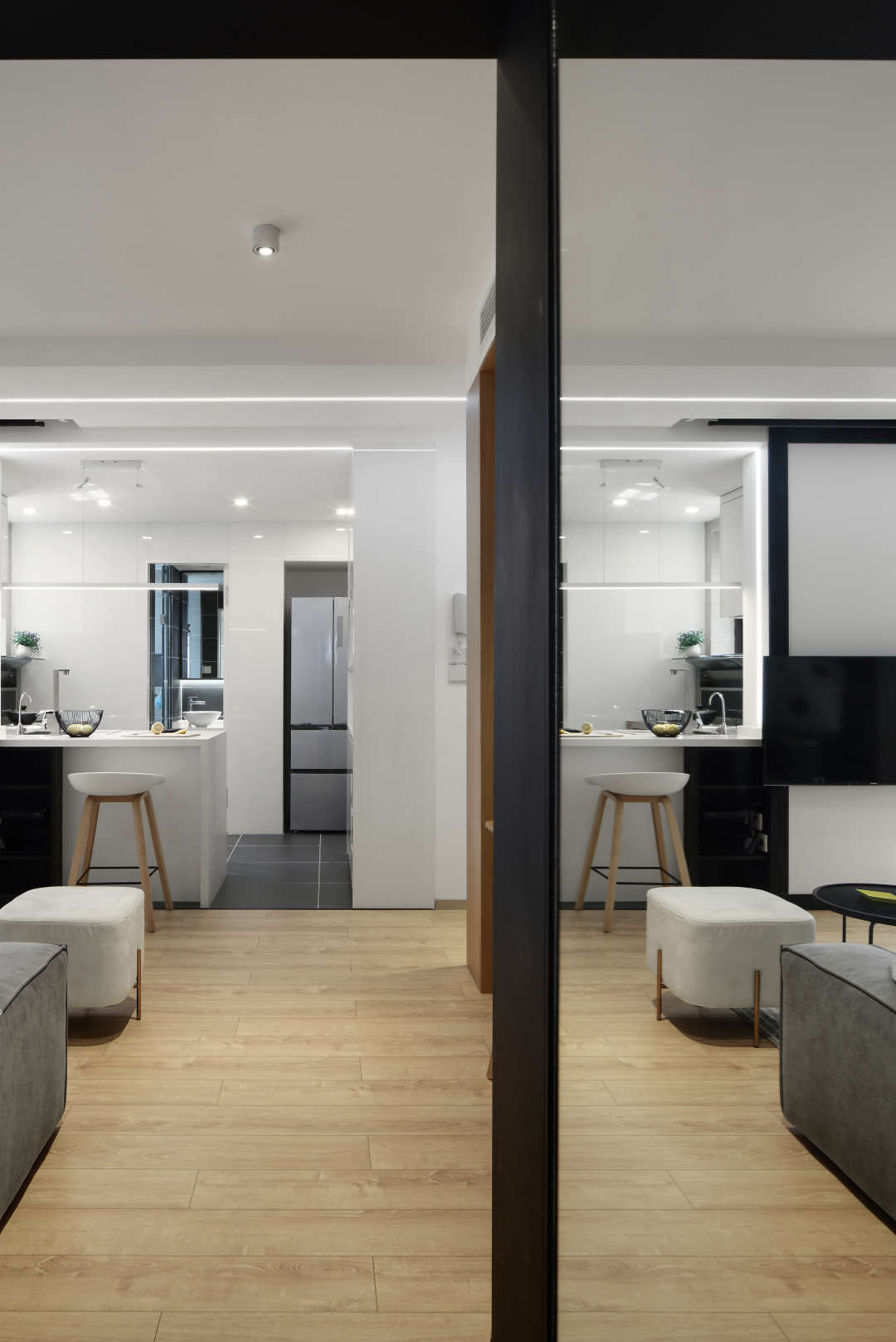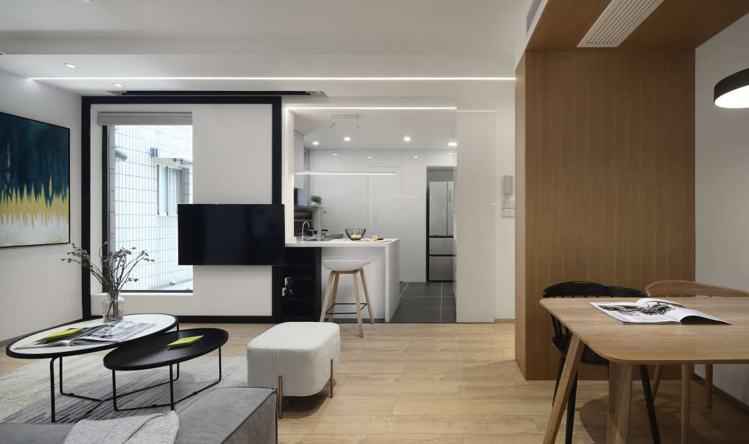 整个电视墙采用虚-实-虚的变化手法,窗户是虚的,白墙是实的,厨房因为是退进去,所以也是虚的,有个空间层次感和叠加感.,电视墙还做了一个8公分黑色金属框,这个八公分都是当初拿捏过比例,黑框和窗的黑框,形成框中框的画面.美感和几何感提升.左面黑框中的比例和厨房虚的比例基本上是1:1,对称感油然而生.