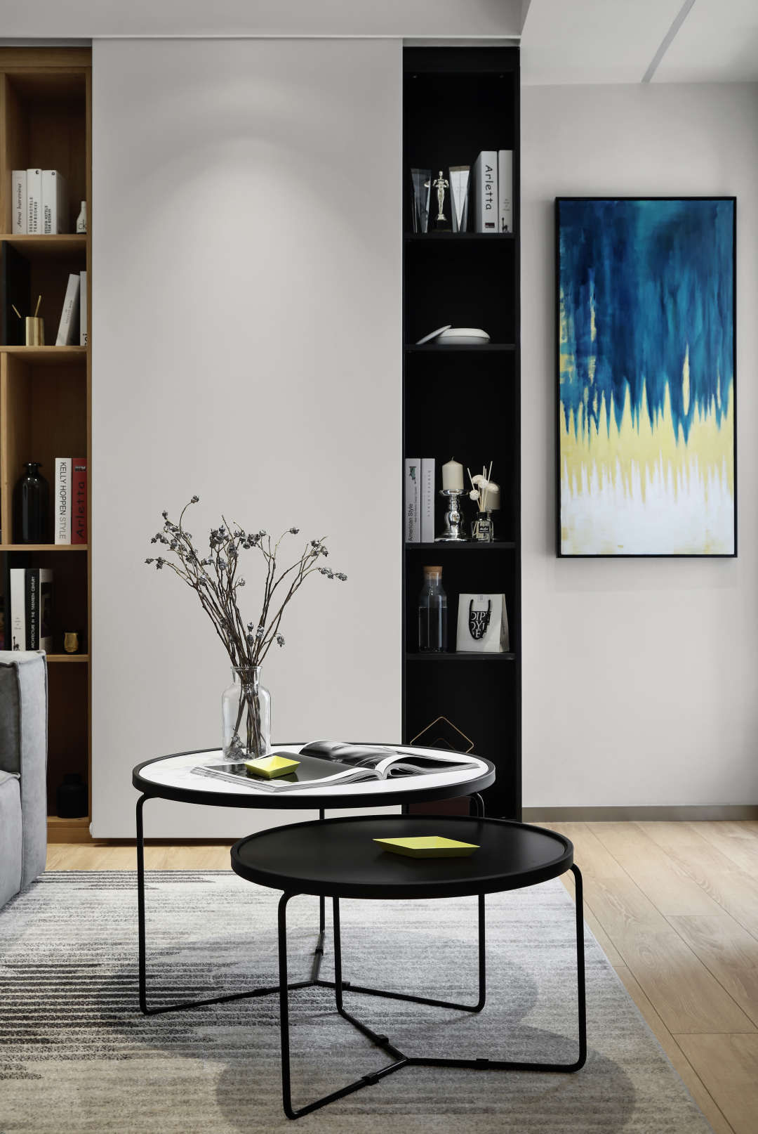 书柜是虚实虚的结合,用了黑色烤漆密度板和木饰面颗粒板组合,黑色烤漆竖板是12厚,木饰面颗粒板是18厚.两种不同厚度的板材来组合书柜,让整体看上去更加精致和用心.同时白色的是移门,可以左右滑动,让敞开区域可以不断变化.